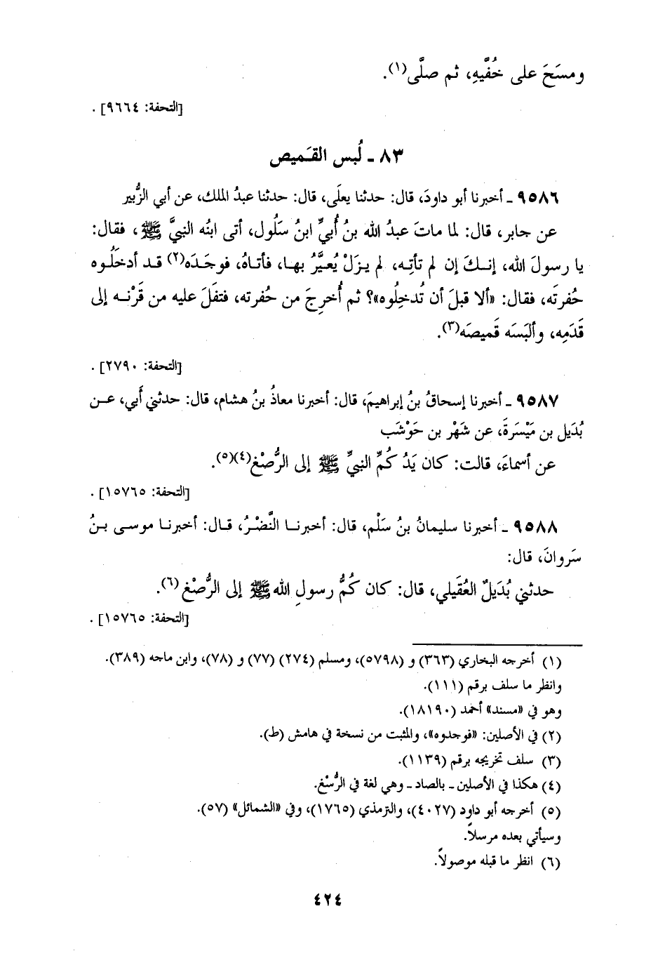 9588 - أَخْبَرَنَا سُلَيْمَانُ بْنُ سَلْمٍ، قَالَ: أَخْبَرَنَا النَّضْرُ، قَالَ: أَخْبَرَنَا مُوسَى بْنُ سَرْوَانَ، قَالَ: حَدَّثَنِي بُدَيْلٌ الْعُقَيْلِيُّ، قَالَ: «§كَانَ كُمُّ رَسُولِ اللهِ صَلَّى اللهُ عَلَيْهِ وَسَلَّمَ إِلَى الرُّصْغِ»