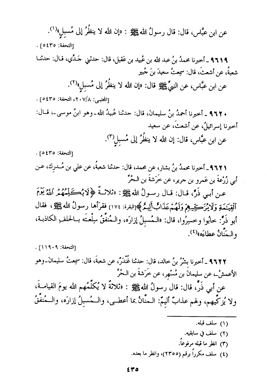 9621 - أَخْبَرَنَا مُحَمَّدُ بْنُ بَشَّارٍ، عَنْ مُحَمَّدٍ، قَالَ: حَدَّثَنَا شُعْبَةُ، عَنِ عَلِيِّ بْنِ مُدْرِكٍ، عَنْ أَبِي زَرْعَةَ بْنِ عَمْرِو بْنِ جَرِيرٍ، عَنْ خَرَشَةَ بْنِ الْحُرِّ، عَنْ أَبِي ذَرِّ، قَالَ: قَالَ رَسُولُ اللهِ صَلَّى اللهُ عَلَيْهِ وَسَلَّمَ: «§ثَلَاثَةٌ لَا يُكَلِّمُهُمُ اللهُ يَوْمَ الْقِيَامَةِ وَلَا يُزَكِّيهِمْ وَلَهُمْ عَذَابٌ أَلِيمٌ»، فَقَرَأَهَا رَسُولُ اللهِ صَلَّى اللهُ عَلَيْهِ وَسَلَّمَ، فَقَالَ أَبُو ذَرٍّ خَابُوا وَخَسِرُوا، قَالَ: «الْمُسْبِلُ إِزَارَهُ، وَالْمُنْفِقُ سِلْعَتَهُ بِالْحَلِفِ الْكَاذِبَةِ، وَالْمَنَّانُ عَطَاءَهُ»