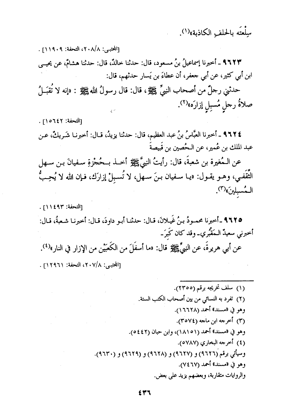 9623 - أَخْبَرَنَا إِسْمَاعِيلُ بْنُ مَسْعُودٍ، قَالَ: حَدَّثَنَا خَالِدٌ، قَالَ: حَدَّثَنَا هِشَامٌ، عَنْ يَحْيَى بْنِ أَبِي كَثِيرٍ، عَنْ أَبِي جَعْفَرٍ، أَنَّ عَطَاءَ بْنَ يَسَارٍ، حَدَّثَهُمْ، قَالَ: حَدَّثَنِي رَجُلٌ، مِنْ أَصْحَابِ النَّبِيِّ صَلَّى اللهُ عَلَيْهِ وَسَلَّمَ، قَالَ: قَالَ رَسُولُ اللهِ صَلَّى اللهُ عَلَيْهِ وَسَلَّمَ: «§إِنَّهُ لَا تُقْبَلُ صَلَاةُ رَجُلٍ مُسْبِلٍ إِزَارَهُ»