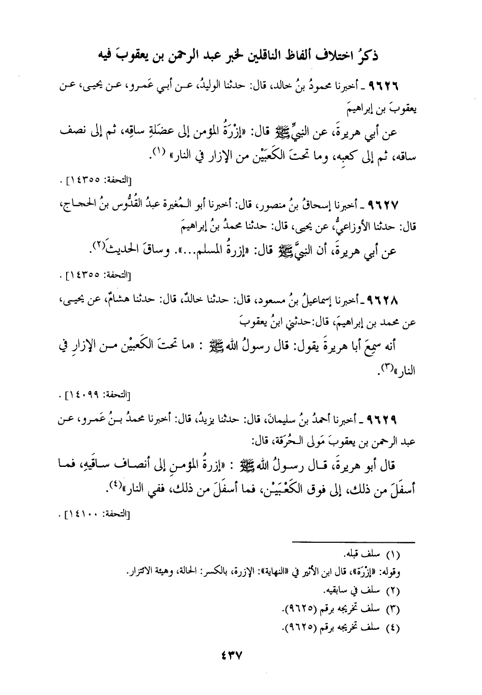9628 - أَخْبَرَنَا إِسْمَاعِيلُ بْنُ مَسْعُودٍ، قَالَ: حَدَّثَنَا خَالِدٌ، قَالَ: حَدَّثَنَا هِشَامٌ، عَنْ يَحْيَى، عَنْ مُحَمَّدِ بْنِ إِبْرَاهِيمَ، قَالَ: حَدَّثَنِي ابْنُ يَعْقُوبَ، أَنَّهُ سَمِعَ أَبَا هُرَيْرَةَ، يَقُولُ: قَالَ رَسُولُ اللهِ صَلَّى اللهُ عَلَيْهِ وَسَلَّمَ: «§مَا تَحْتَ الْكَعْبَيْنِ مِنَ الْإِزَارِ فِي النَّارِ»