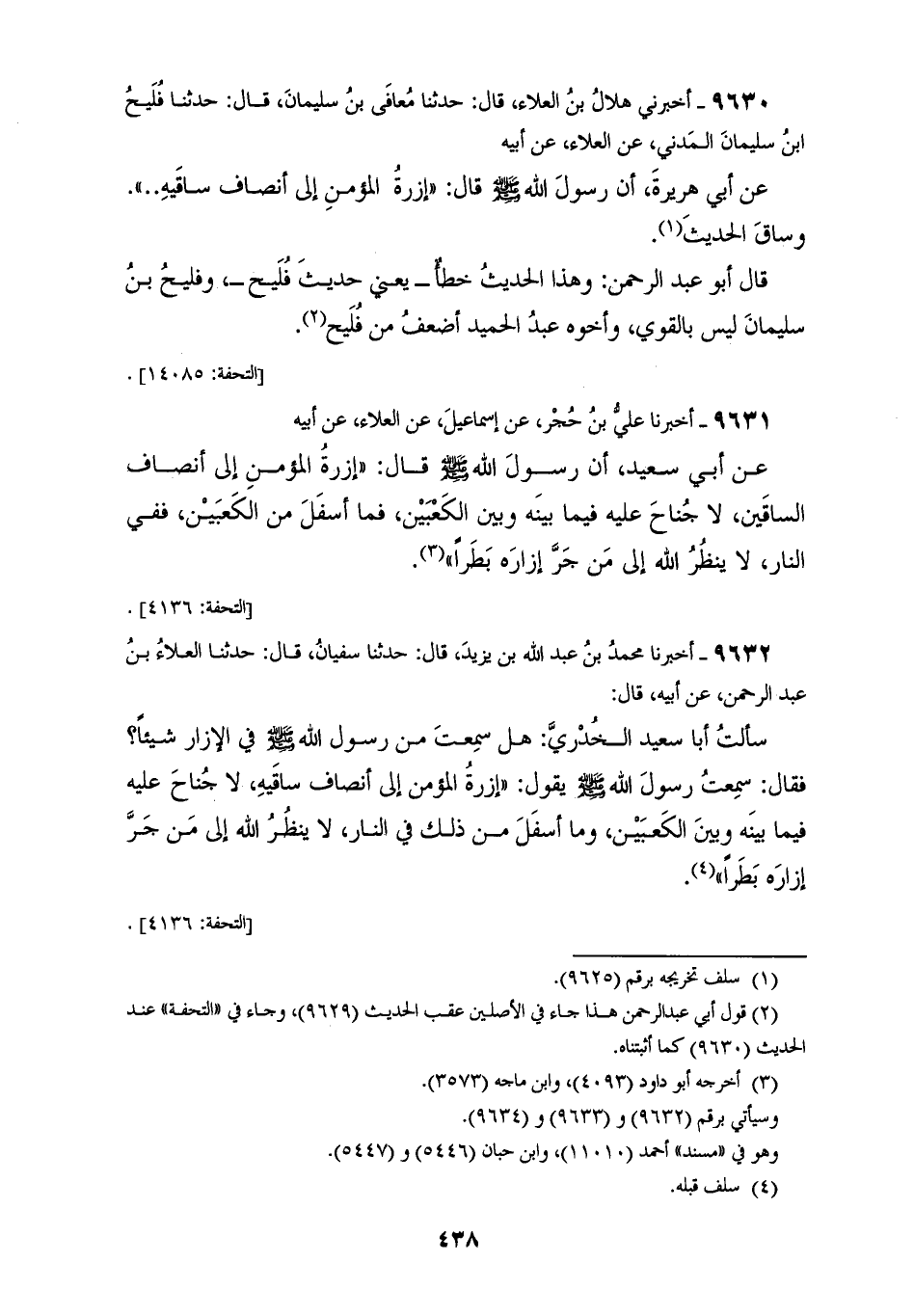 9630 - أَخْبَرَنِي هِلَالُ بْنُ الْعَلَاءِ، قَالَ: حَدَّثَنَا مُعَافَى بْنُ سُلَيْمَانَ، قَالَ: حَدَّثَنَا فُلَيْحُ بْنُ سُلَيْمَانَ الْمَدَنِيُّ، عَنِ الْعَلَاءِ، عَنْ أَبِيهِ، عَنْ أَبِي هُرَيْرَةَ، أَنَّ رَسُولَ اللهِ صَلَّى اللهُ عَلَيْهِ وَسَلَّمَ قَالَ: «§إِزْرَةُ الْمُؤْمِنِ إِلَى أَنْصَافِ سَاقَيْهِ. . . . .» وَسَاقَ الْحَدِيثَ. قَالَ أَبُو عَبْدِ الرَّحْمَنِ: وَهَذَا الْحَدِيثُ خَطَأٌ، يَعْنِي حَدِيثَ فُلَيْحٍ، وَفُلَيْحُ بْنُ سُلَيْمَانَ لَيْسَ بِالْقَوِيِّ، وَأَخُوهُ عَبْدُ الْحَمِيدِ أَضْعَفُ مِنْ فُلَيْحٍ