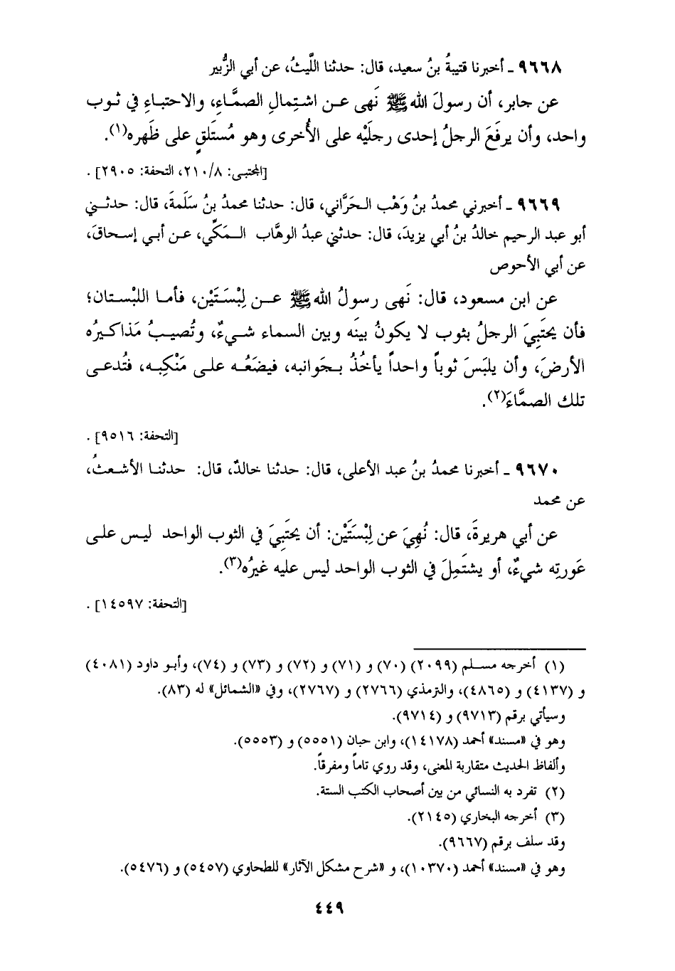 9669 - أَخْبَرَنِي مُحَمَّدُ بْنُ وَهْبٍ الْحَرَّانِيُّ، قَالَ: حَدَّثَنَا مُحَمَّدُ بْنُ سَلَمَةَ، قَالَ: حَدَّثَنِي أَبُو عَبْدِ الرَّحِيمِ خَالِدُ بْنُ أَبِي يَزِيدَ، قَالَ: حَدَّثَنِي عَبْدُ الْوَهَّابِ الْمَكِّيُّ، عَنْ أَبِي إِسْحَاقَ، عَنْ أَبِي الْأَحْوَصِ، عَنِ ابْنِ مَسْعُودٍ قَالَ: " §نَهَى رَسُولُ اللهِ صَلَّى اللهُ عَلَيْهِ وَسَلَّمَ عَنْ لِبْسَتَيْنِ، فَأَمَّا اللِّبْسَتَانِ: فَأَنْ يَحْتَبِيَ الرَّجُلُ بِثَوْبٍ لَا يَكُونُ بَيْنَهُ وَبَيْنَ السَّمَاءِ شَيْءٌ، وَتُصِيبُ مَذاكِيرَهُ الْأَرْضُ، وَأَنْ يَلْبَسَ ثَوْبًا وَاحِدًا يَأْخُذُ بِجَوَانِبِهِ فَيَضَعُهُ عَلَى مَنْكِبَهُ فَتُدْعَى تِلْكَ الصَّمَّاءُ "