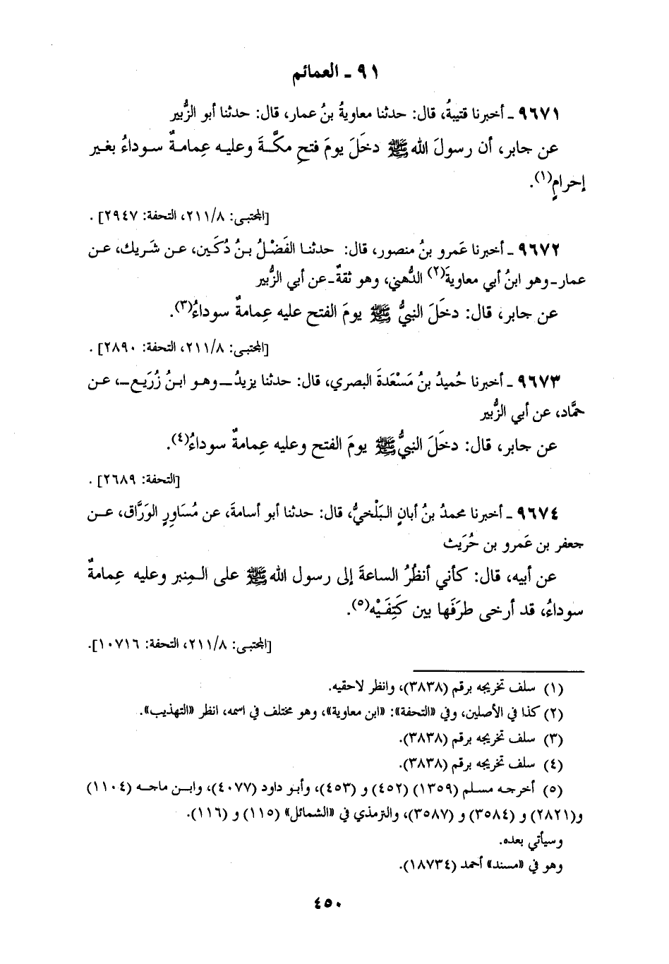 9673 - أَخْبَرَنَا حُمَيْدُ بْنُ مَسْعَدَةَ الْبَصْرِيُّ، قَالَ: حَدَّثَنَا يَزِيدُ وَهُوَ ابْنُ زُرَيْعٍ، عَنْ حَمَّادٍ، عَنْ أَبِي الزُّبَيْرِ، عَنْ جَابِرٍ قَالَ: «§دَخَلَ النَّبِيُّ صَلَّى اللهُ عَلَيْهِ وَسَلَّمَ يَوْمَ الْفَتْحِ وَعَلَيْهِ عِمَامَةٌ سَوْدَاءُ»