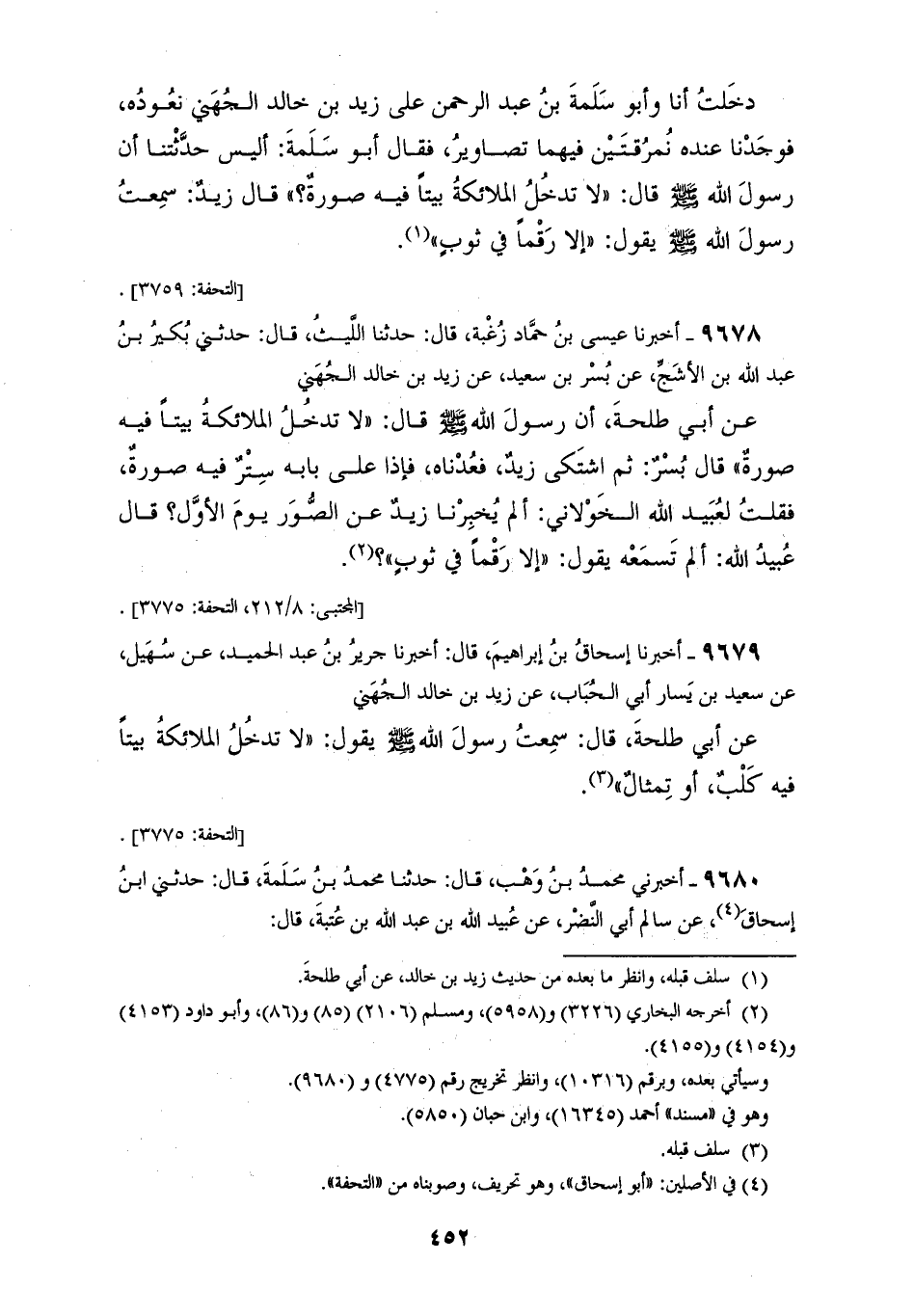 9678 - أَخْبَرَنَا عِيسَى بْنُ حَمَّادٍ زُغْبَةَ، قَالَ: حَدَّثَنَا اللَّيْثُ قَالَ: حَدَّثَنِي بُكَيْرُ بْنُ عَبْدِ اللهِ بْنِ الْأَشَجِّ، عَنْ بُسْرِ بْنِ سَعِيدٍ، عَنْ زَيْدِ بْنِ خَالِدٍ الْجُهَنِيِّ، عَنْ أَبِي طَلْحَةَ أَنَّ رَسُولَ اللهِ صَلَّى اللهُ عَلَيْهِ وَسَلَّمَ قَالَ: «§لَا تَدْخُلُ الْمَلَائِكَةُ بَيْتًا فِيهِ صُورَةٌ»، قَالَ بُسْرٌ: ثُمَّ اشْتَكَى زَيْدٌ فَعُدْنَاهُ، فَإِذَا عَلَى بَابِهِ سِتْرٌ فِيهِ صُورَةٌ، فَقُلْتُ لِعُبَيْدِ اللهِ الْخَوْلَانِيِّ: أَلَمْ يُخْبِرْنَا زَيْدٌ عَنِ الصُّورِ يَوْمَ الْأَوَّلِ؟ قَالَ عُبَيْدُ اللهِ: أَلَمْ تَسْمَعْهُ يَقُولُ: «إِلَّا رَقْمًا فِي ثَوْبٍ؟»