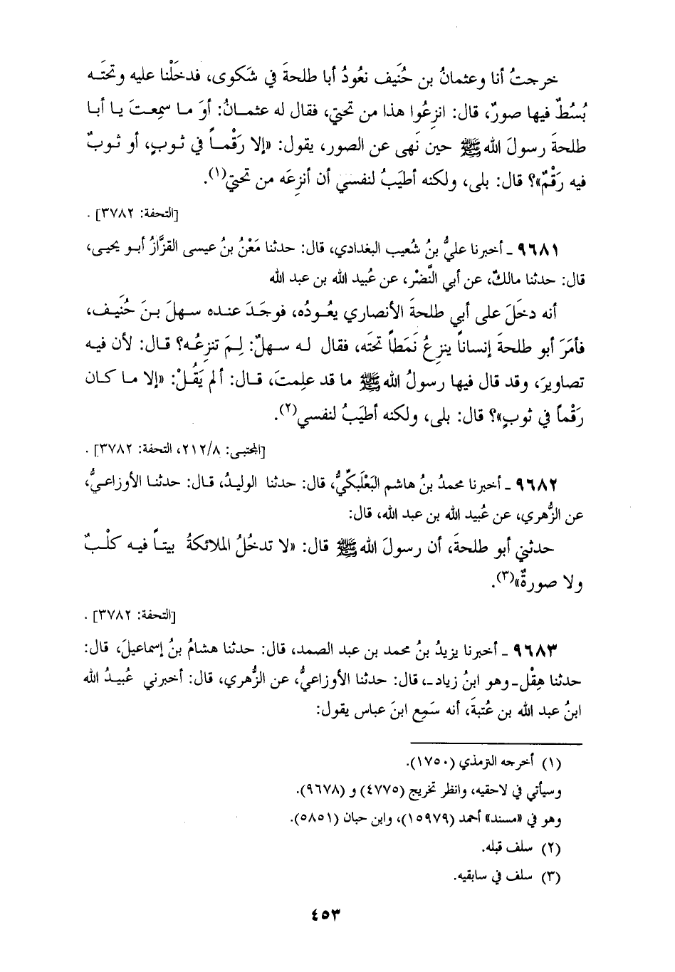 9681 - أَخْبَرَنَا عَلِيُّ بْنُ شُعَيْبٍ الْبَغْدَادِيُّ، قَالَ: حَدَّثَنَا مَعْنُ بْنُ عِيسَى الْقَزَّازُ أَبُو يَحْيَى قَالَ: حَدَّثَنَا مَالِكٌ، عَنْ أَبِي النَّضْرِ، عَنْ عُبَيْدِ اللهِ بْنِ عَبْدِ اللهِ، أَنَّهُ دَخَلَ عَلَى أَبِي طَلْحَةَ الْأَنْصَارِيِّ يَعُودُهُ فَوَجَدَ عِنْدَهُ سَهْلَ بْنَ حُنَيْفٍ فَأَمَرَ أَبُو طَلْحَةَ إِنْسَانًا يَنْزِعُ نَمَطًا تَحْتَهُ، فَقَالَ لَهُ سَهْلٌ: لِمَ تَنْزِعُهُ؟ قَالَ: لِأَنَّ فِيهِ تَصَاوِيرَ، وَقَدْ قَالَ فِيهَا رَسُولُ اللهِ صَلَّى اللهُ عَلَيْهِ وَسَلَّمَ مَا قَدْ عَلِمْتَ، قَالَ: أَلَمْ يَقُلْ «§إِلَّا مَا كَانَ رَقْمًا فِي ثَوْبٍ»، قَالَ: بَلَى، وَلَكِنَّهُ أَطْيَبُ لِنَفْسِي