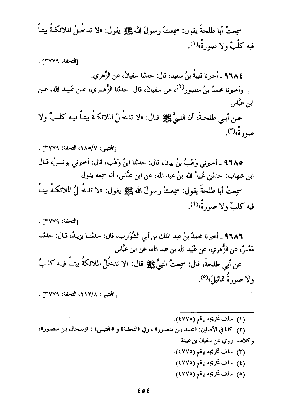 9684 - أَخْبَرَنَا قُتَيْبَةُ بْنُ سَعِيدٍ، قَالَ: حَدَّثَنَا سُفْيَانُ، عَنِ الزُّهْرِيِّ، وَأَخْبَرَنَا مُحَمَّدُ بْنُ مَنْصُورٍ، عَنْ سُفْيَانَ قَالَ: حَدَّثَنَا الزُّهْرِيُّ، عَنْ عُبَيْدِ اللهِ، عَنِ ابْنِ عَبَّاسٍ، عَنْ أَبِي طَلْحَةَ أَنَّ النَّبِيَّ صَلَّى اللهُ عَلَيْهِ وَسَلَّمَ، قَالَ: «§لَا تَدْخُلُ الْمَلَائِكَةُ بَيْتًا فِيهِ كَلْبٌ، وَلَا صُورَةٌ»