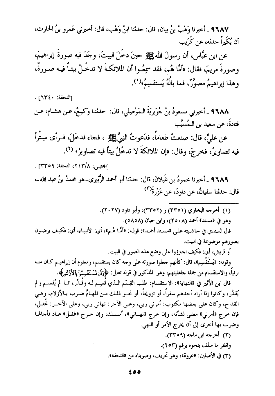 9687 - أَخْبَرَنَا وَهْبُ بْنُ بَيَانَ، قَالَ: حَدَّثَنَا ابْنُ وَهْبٍ، قَالَ: أَخْبَرَنِي عَمْرُو بْنُ الْحَارِثِ، أَنَّ بُكَيْرًا حَدَّثَهُ، عَنْ كُرَيْبٍ، عَنِ ابْنِ عَبَّاسٍ " أَنَّ رَسُولَ اللهِ صَلَّى اللهُ عَلَيْهِ وَسَلَّمَ حِينَ §دَخَلَ الْبَيْتَ وَجَدَ فِيهِ صُورَةَ إِبْرَاهِيمَ، وَصُورَةَ مَرْيَمَ فَقَالَ: «أَمَّا هُمْ فَقَدْ سَمِعُوا أَنَّ الْمَلَائِكَةَ لَا تَدْخُلُ بَيْتًا فِيهِ صُورَةٌ، وَهَذَا إِبْرَاهِيمُ مُصَوَّرٌ فَمَا بَالُهُ يَسْتَقْسِمُ»