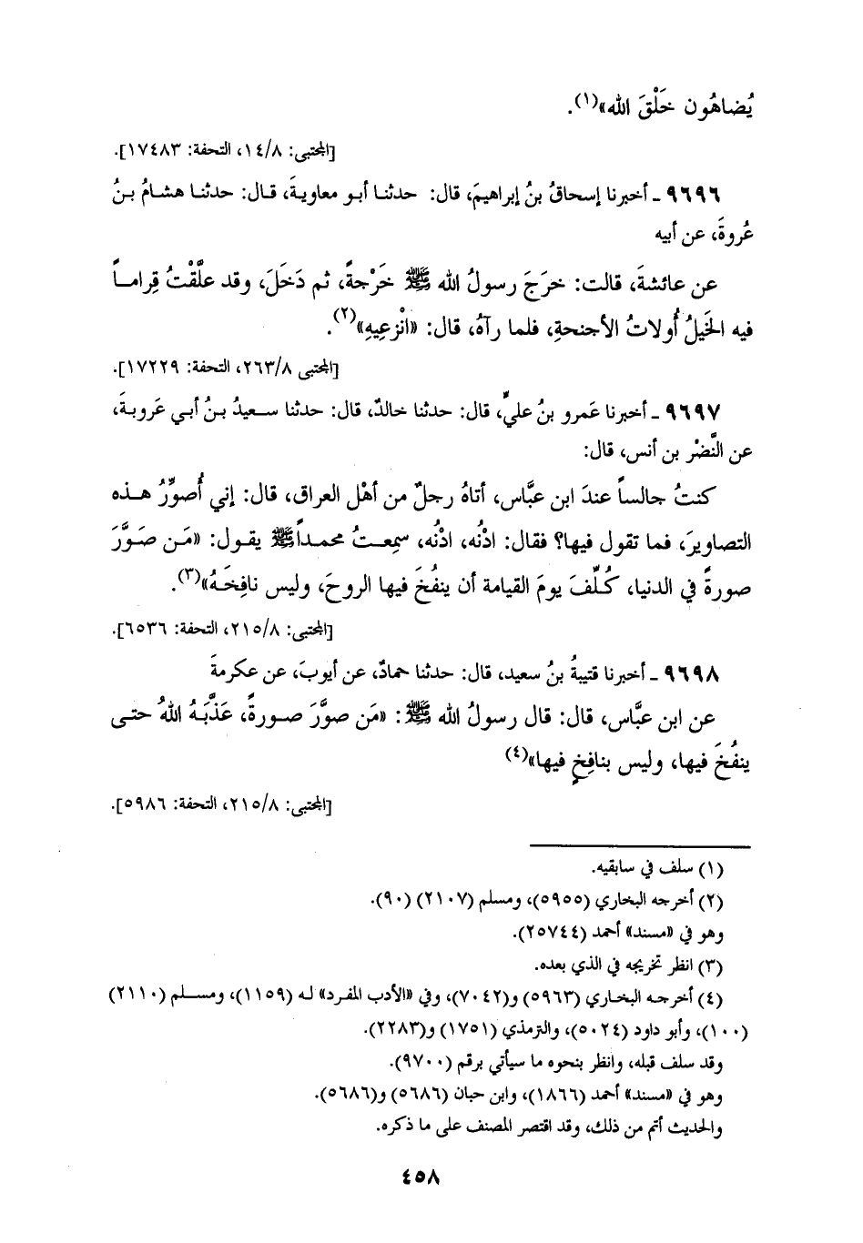 9697 - أَخْبَرَنَا عَمْرُو بْنُ عَلِيٍّ قَالَ: حَدَّثَنَا خَالِدٌ قَالَ: حَدَّثَنَا سَعِيدُ بْنُ أَبِي عَرُوبَةَ، عَنِ النَّضْرِ بْنِ أَنَسٍ قَالَ: كُنْتُ جَالِسًا عِنْدَ ابْنَ عَبَّاسٍ أَتَاهُ رَجُلٌ مِنْ أَهْلِ الْعِرَاقِ، قَالَ: إِنِّي أُصَوِّرُ هَذِهِ التَّصَاوِيرَ فَمَا تَقُولُ فِيهَا؟ فَقَالَ: ادْنُهُ ادْنُهُ سَمِعْتُ مُحَمَّدًا صَلَّى اللهُ عَلَيْهِ وَسَلَّمَ يَقُولُ: «§مَنْ صَوَّرَ صُورَةً فِي الدُّنْيَا كُلِّفَ يَوْمَ الْقِيَامَةِ أَنْ يَنْفُخَ فِيهَا الرُّوحَ، وَلَيْسَ نَافِخَهُ»