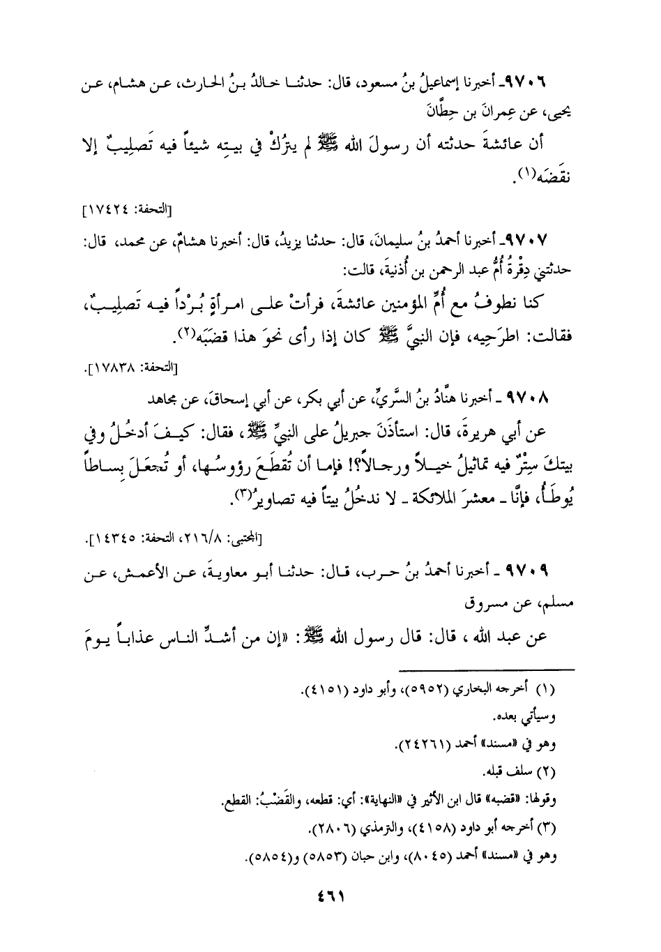 9706 - أَخْبَرَنَا إِسْمَاعِيلُ بْنُ مَسْعُودٍ، قَالَ: حَدَّثَنَا خَالِدُ بْنُ الْحَارِثِ، عَنْ هِشَامٍ، عَنْ يَحْيَى، عَنْ عِمْرَانَ بْنِ حِطَّانَ، أَنَّ عَائِشَةَ حَدَّثَتْهُ أَنَّ رَسُولَ اللهِ صَلَّى اللهُ عَلَيْهِ وَسَلَّمَ §لَمْ يَتْرُكْ فِي بَيْتِهِ شَيْئًا فِيهِ تَصْلِيبٌ إِلَّا نَقَضَهُ
