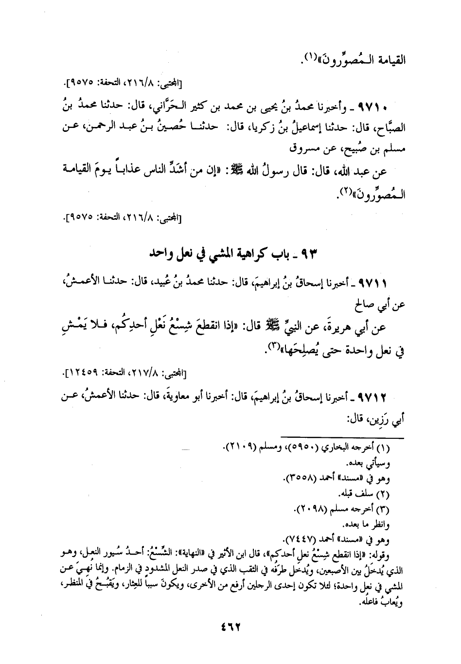 9711 - أَخْبَرَنَا إِسْحَاقُ بْنُ إِبْرَاهِيمَ قَالَ: حَدَّثَنَا مُحَمَّدُ بْنُ عُبَيْدٍ قَالَ: حَدَّثَنَا الْأَعْمَشُ، عَنْ أَبِي صَالِحٍ، عَنْ أَبِي هُرَيْرَةَ، عَنِ النَّبِيِّ صَلَّى اللهُ عَلَيْهِ وَسَلَّمَ قَالَ: «§إِذَا انْقَطَعَ شِسْعُ نَعْلِ أَحَدِكُمْ فَلَا يَمْشِ فِي نَعْلٍ وَاحِدَةٍ حَتَّى يُصْلِحَهَا»