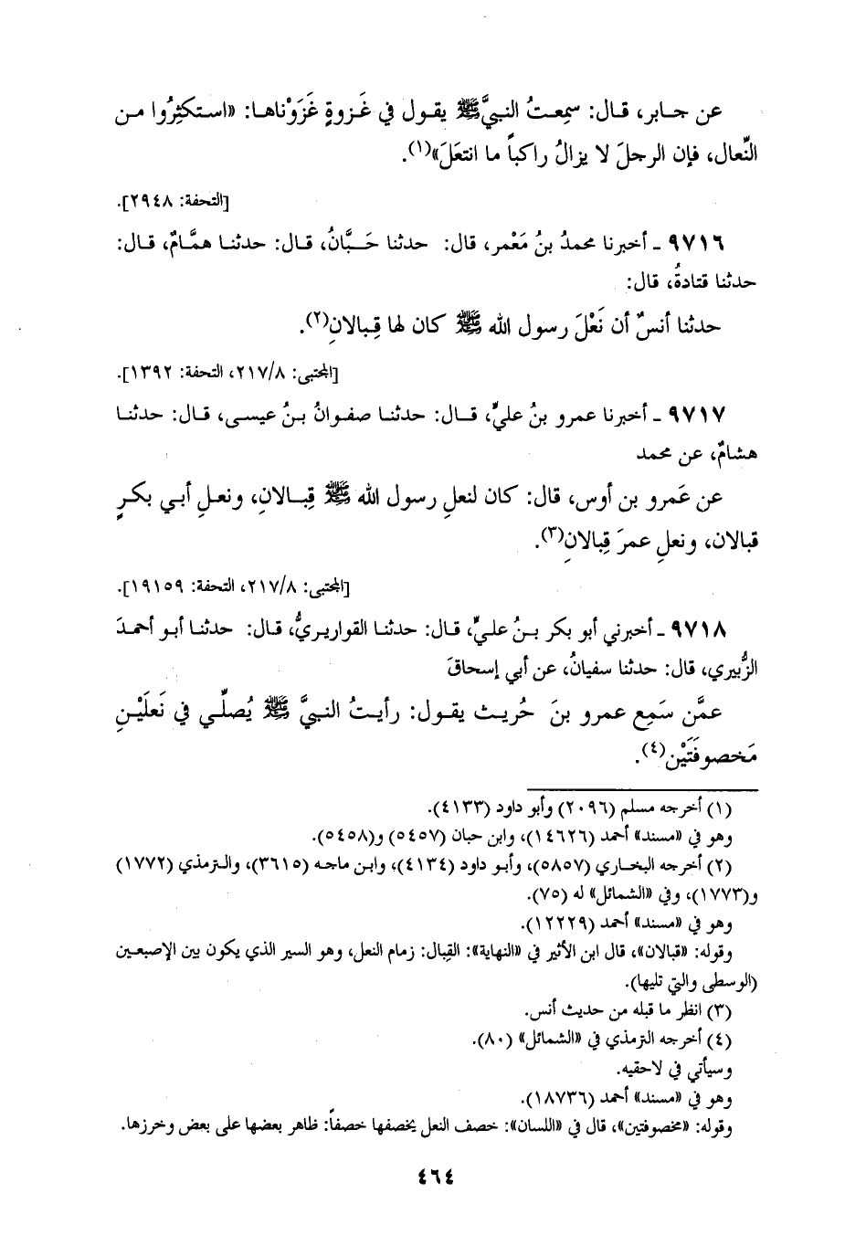 9716 - أَخْبَرَنَا مُحَمَّدُ بْنُ مَعْمَرٍ قَالَ: حَدَّثَنَا حَبَّانُ قَالَ: حَدَّثَنَا هَمَّامٌ قَالَ: حَدَّثَنَا قَتَادَةُ قَالَ: حَدَّثَنَا أَنَسٌ «§أَنَّ نَعْلَ رَسُولِ اللهِ صَلَّى اللهُ عَلَيْهِ وَسَلَّمَ كَانَ لَهَا قِبَالَانِ»