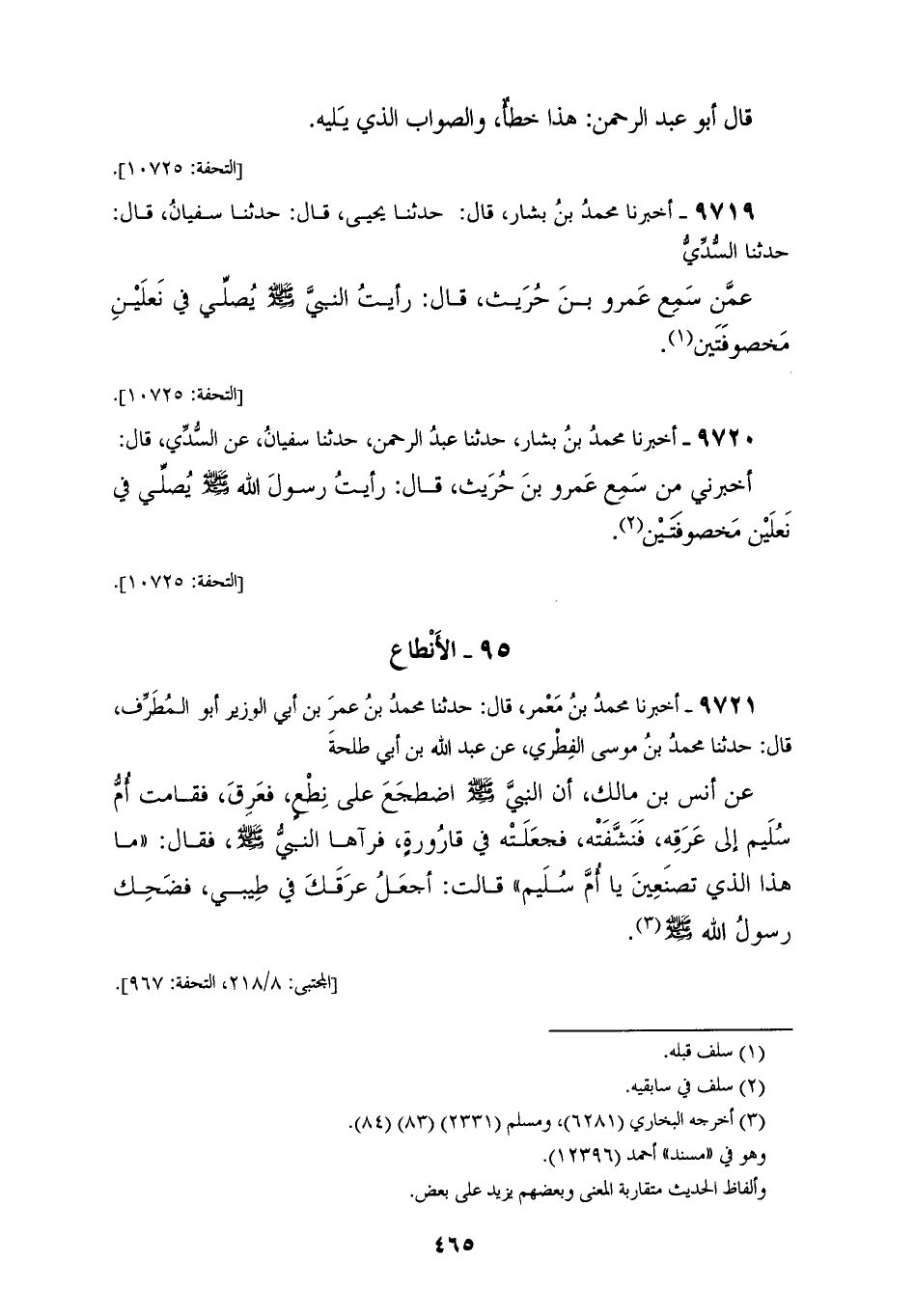 9720 - أَخْبَرَنَا مُحَمَّدُ بْنُ بَشَّارٍ، حَدَّثَنَا عَبْدُ الرَّحْمَنِ، حَدَّثَنَا سُفْيَانُ، عَنِ السُّدِّيِّ قَالَ: أَخْبَرَنِي مَنْ سَمِعَ عَمْرَو بْنَ حُرَيْثٍ قَالَ: «§رَأَيْتُ رَسُولَ اللهِ صَلَّى اللهُ عَلَيْهِ وَسَلَّمَ يُصَلِّي فِي نَعْلَيْنِ مَخْصُوفَتَيْنِ»