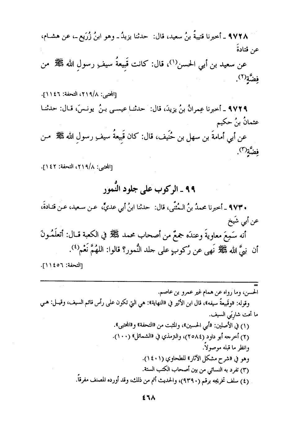 9730 - أَخْبَرَنَا مُحَمَّدُ بْنُ الْمُثَنَّى، قَالَ: حَدَّثَنَا ابْنُ أَبِي عَدِيٍّ، عَنْ سَعِيدٍ، عَنْ قَتَادَةَ، عَنْ أَبِي شَيْخٍ، أَنَّهُ سَمِعَ مُعَاوِيَةَ وَعِنْدَهُ جَمْعٌ مِنْ أَصْحَابِ مُحَمَّدٍ صَلَّى اللهُ عَلَيْهِ وَسَلَّمَ فِي الْكَعْبَةِ قَالَ: «أَتَعْلَمُونَ أَنَّ نَبِيَّ اللهِ صَلَّى اللهُ عَلَيْهِ وَسَلَّمَ §نَهَى عَنْ رُكُوبِ عَلَى جِلْدِ النُّمُورِ؟» قَالُوا: «اللهُمَّ نَعَمْ»