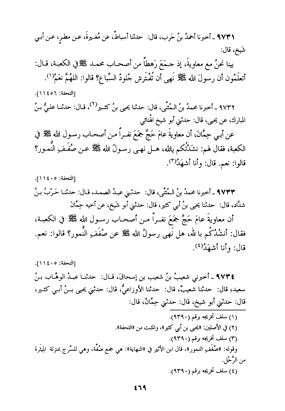 9733 - أَخْبَرَنَا مُحَمَّدُ بْنُ الْمُثَنَّى قَالَ: حَدَّثَنِي عَبْدُ الصَّمَدِ قَالَ: حَدَّثَنَا حَرْبُ بْنُ شَدَّادٍ قَالَ: حَدَّثَنَا يَحْيَى بْنُ أَبِي كَثِيرٍ قَالَ: حَدَّثَنِي أَبُو شَيْخٍ، عَنْ أَخِيهِ حِمَّانَ أَنَّ مُعَاوِيَةَ عَامَ حَجَّ جَمَعَ نَفَرًا مِنْ أَصْحَابِ رَسُولِ اللهِ صَلَّى اللهُ عَلَيْهِ وَسَلَّمَ فِي الْكَعْبَةِ، فَقَالَ: «أَنْشُدُكُمْ بِاللهِ، §هَلْ نَهَى رَسُولُ اللهِ صَلَّى اللهُ عَلَيْهِ وَسَلَّمَ عَنْ صَفَفِ النُّمُورِ؟» قَالُوا: «نَعَمْ» قَالَ: «وَأَنَا أَشْهَدُ»