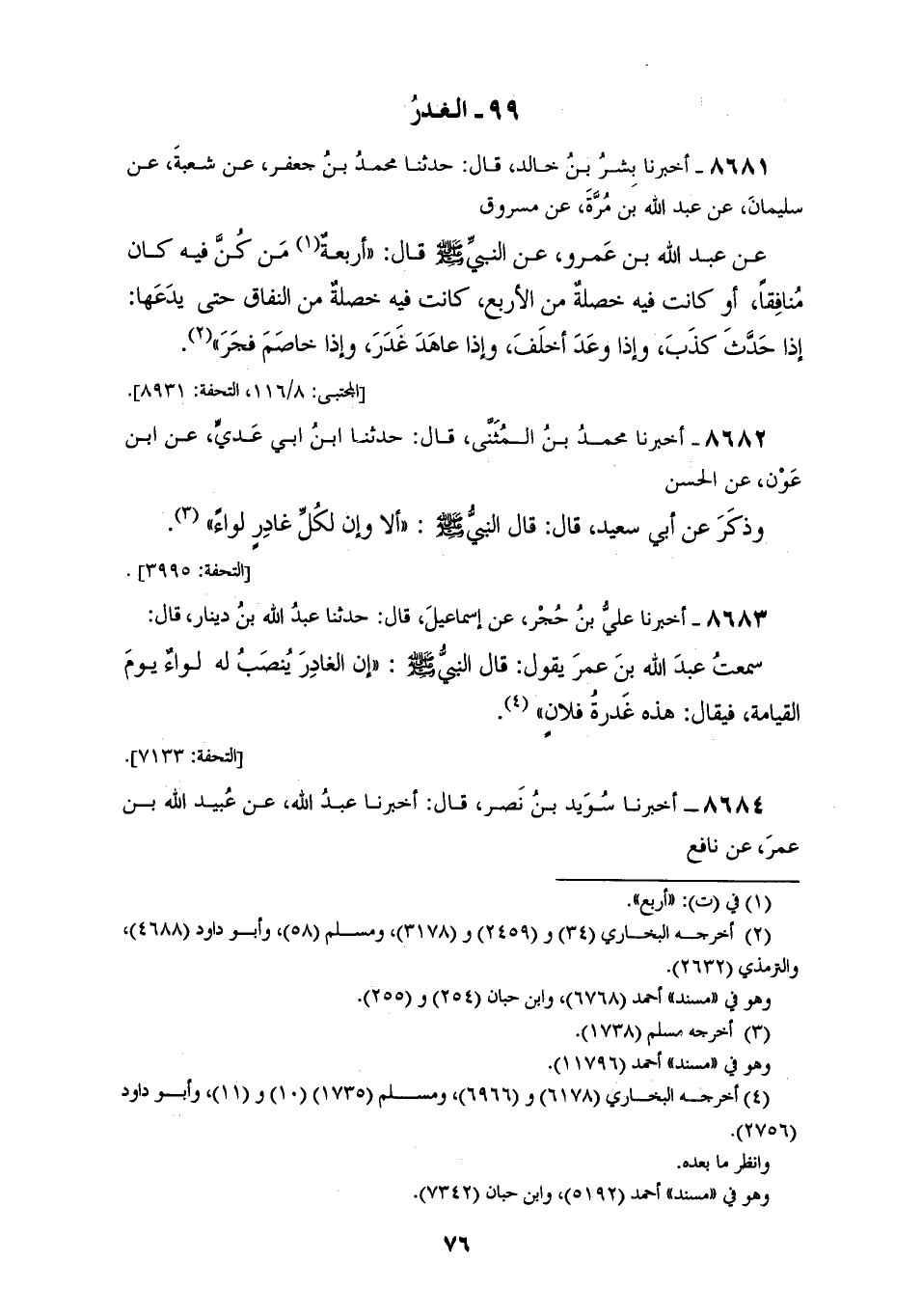 8681 - أَخْبَرَنَا بِشْرُ بْنُ خَالِدٍ قَالَ: حَدَّثَنَا مُحَمَّدُ بْنُ جَعْفَرٍ، عَنْ شُعْبَةَ، عَنْ سُلَيْمَانَ، عَنْ عَبْدِ اللهِ بْنِ مُرَّةَ، عَنْ مَسْرُوقٍ، عَنْ عَبْدِ اللهِ بْنِ عَمْرٍو، عَنِ النَّبِيِّ صَلَّى اللهُ عَلَيْهِ وَسَلَّمَ قَالَ: «§أَرْبَعَةٌ مَنْ كُنَّ فِيهِ كَانَ مُنَافِقًا، أَوْ كَانَتْ فِيهِ خَصْلَةٌ مِنَ الْأَرْبَعِ كَانَتْ فِيهِ خَصْلَةٌ مِنْ النِّفَاقِ حَتَّى يَدَعَهَا، إِذَا حَدَّثَ كَذَبَ، وَإِذَا وَعَدَ أَخْلَفَ، وَإِذَا عَاهَدَ غَدَرَ، وَإِذَا خَاصَمَ فَجَرَ»