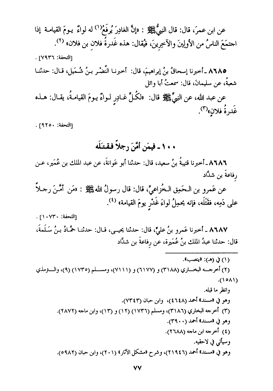 8686 - أَخْبَرَنَا قُتَيْبَةُ بْنُ سَعِيدٍ قَالَ: حَدَّثَنَا أَبُو عَوَانَةَ، عَنْ عَبْدِ الْمَلِكِ بْنِ عُمَيْرٍ، عَنْ رِفَاعَةَ بْنِ شَدَّادٍ، عَنْ عَمْرِو بْنِ الْحَمِقِ الْخُزَاعِيِّ قَالَ: قَالَ رَسُولُ اللهِ صَلَّى اللهُ عَلَيْهِ وَسَلَّمَ: «§مَنْ آمَنَ رَجُلًا عَلَى دَمِهِ فَقَتَلَهُ، فَإِنَّهُ يُحْمَلُ لِوَاءَ غَدِرٍ يَوْمَ الْقِيَامَةِ»