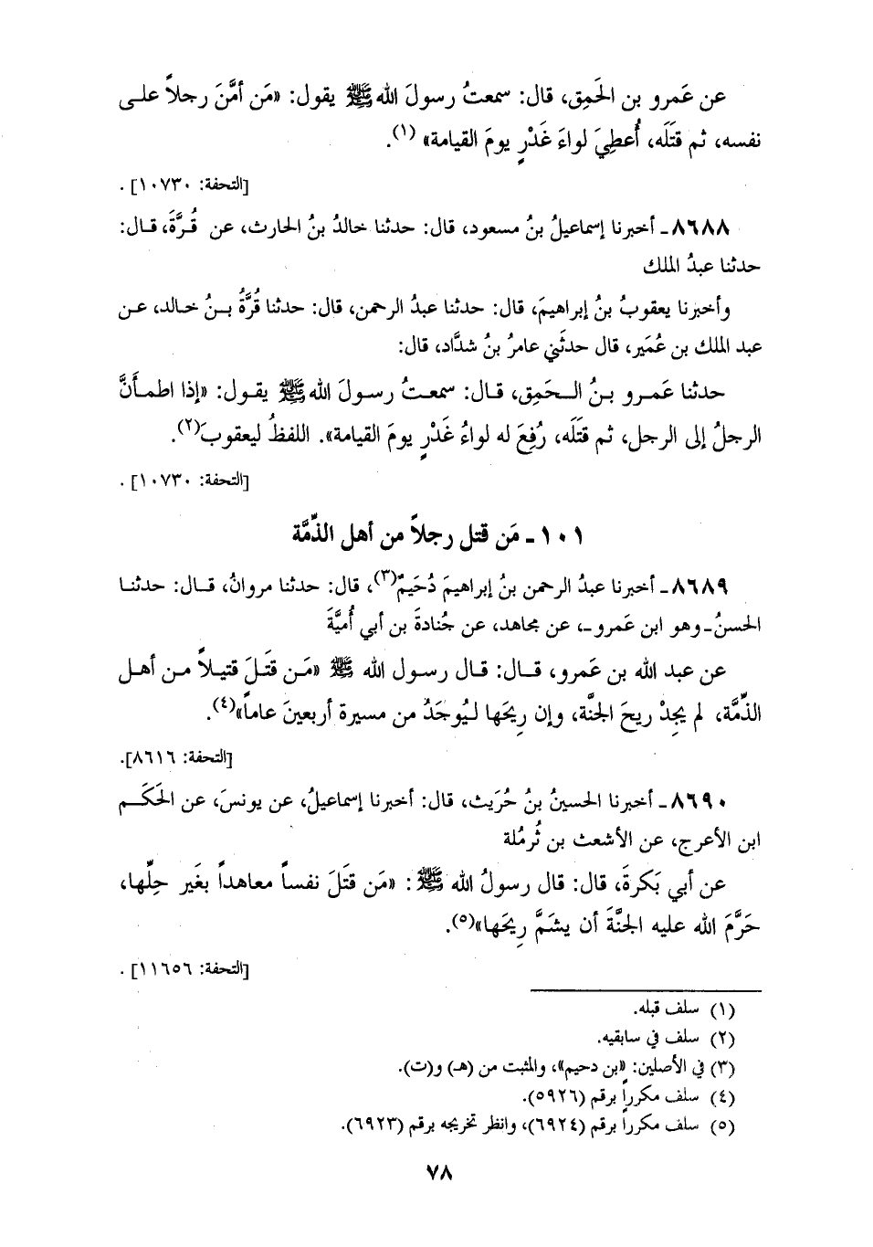 8690 - أَخْبَرَنَا الْحُسَيْنُ بْنُ حُرَيْثٍ قَالَ: أَخْبَرَنَا إِسْمَاعِيلُ، عَنْ يُونُسَ، عَنِ الْحَكَمِ بْنِ الْأَعْرَجِ، عَنِ الْأَشْعَثِ بْنِ ثُرْمُلَةَ، عَنْ أَبِي بَكْرَةَ قَالَ: قَالَ رَسُولُ اللهِ صَلَّى اللهُ عَلَيْهِ وَسَلَّمَ: «§مَنْ قَتَلَ نَفْسًا مُعَاهَدًا بِغَيْرِ حَلِّهَا حَرَّمَ اللهُ عَلَيْهِ الْجَنَّةَ أَنْ يَشَمَّ رِيحَهَا»