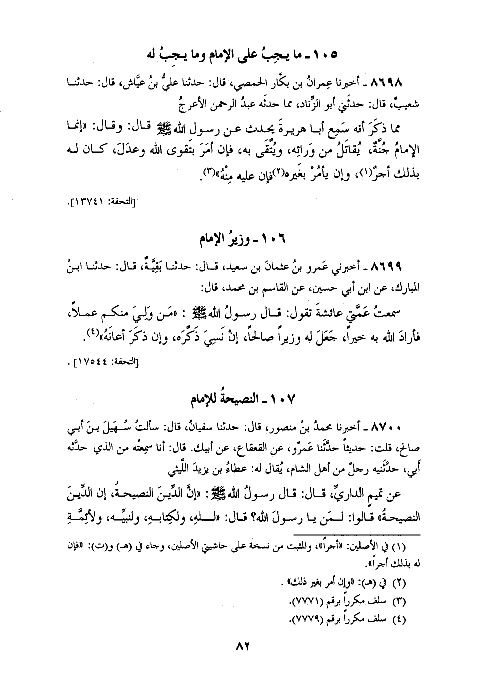 8700 - أَخْبَرَنَا مُحَمَّدُ بْنُ مَنْصُورٍ قَالَ: حَدَّثَنَا سُفْيَانُ قَالَ: سَأَلْتُ سُهَيْلَ بْنَ أَبِي صَالِحٍ قُلْتُ: حَدِيثًا حَدَّثَنَا عَمْرٌو، عَنِ الْقَعْقَاعِ، عَنْ أَبِيكَ قَالَ: أَنَا سَمِعْتُهُ مِنَ الَّذِي حَدَّثَهُ أَبِي حَدَّثَنِيهِ رَجُلٌ مِنْ أَهْلِ الشَّامِ يُقَالُ لَهُ عَطَاءُ بْنُ يَزِيدَ اللَّيْثِيُّ عَنْ تَمِيمٍ الدَّارِيِّ قَالَ: قَالَ رَسُولُ اللهِ صَلَّى اللهُ عَلَيْهِ وَسَلَّمَ: «§إِنَّ الدِّينَ النَّصِيحَةُ إِنَّ الدِّينَ النَّصِيحَةُ» قَالُوا: لِمَنْ يَا رَسُولَ اللهِ؟ قَالَ: «لِلَّهِ وَلِكِتَابِهِ وَلِنَبِيِّهِ وَلِأَئِمَّةِ الْمُسْلِمِينَ وَعَامَّتِهِمْ»