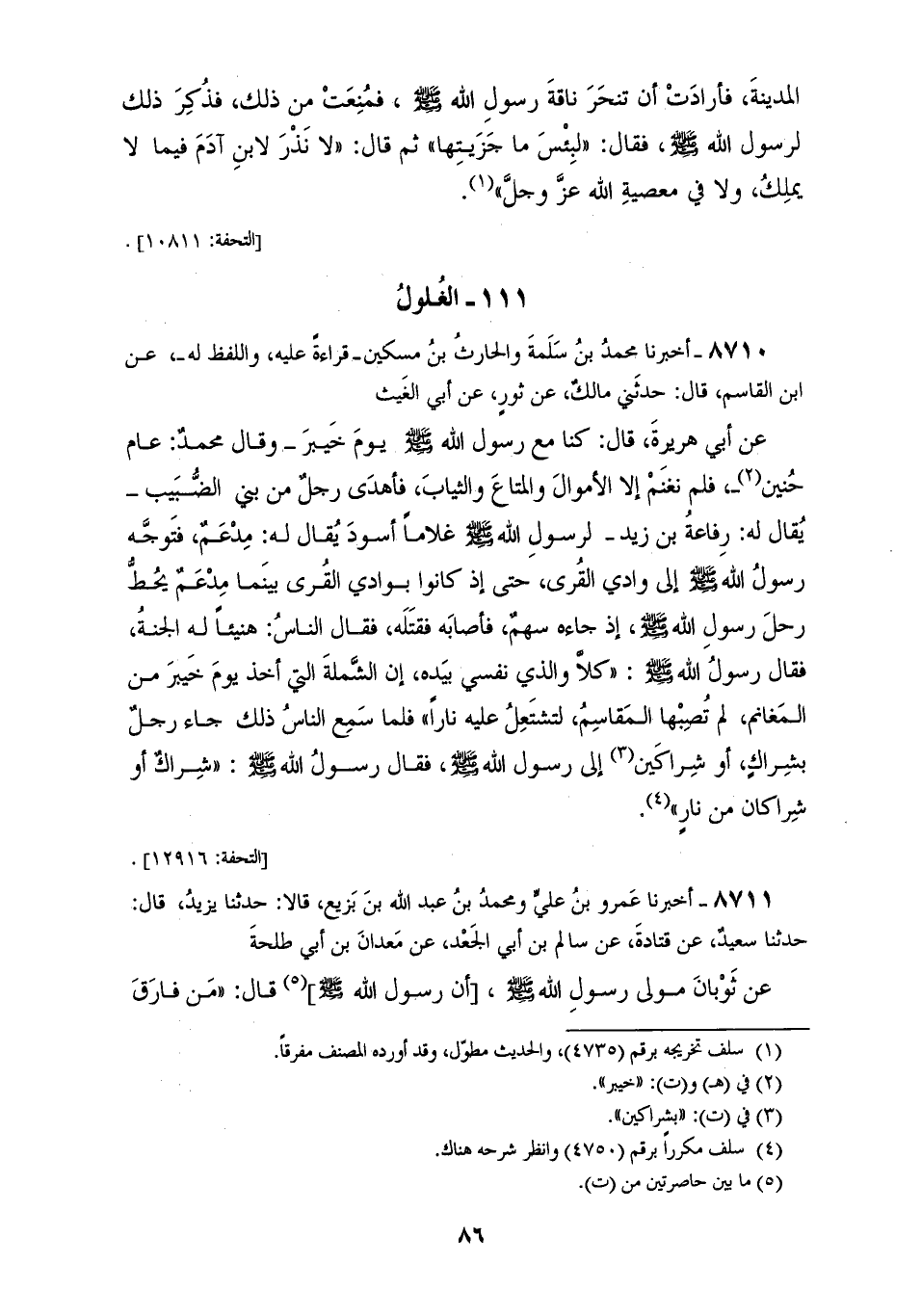 8710 - أَخْبَرَنَا مُحَمَّدُ بْنُ سَلَمَةَ، وَالْحَارِثُ بْنُ مِسْكِينٍ، قِرَاءَةً عَلَيْهِ وَاللَّفْظُ لَهُ عَنِ ابْنِ الْقَاسِمِ قَالَ: حَدَّثَنِي مَالِكٌ، عَنْ ثَوْرٍ، عَنْ أَبِي الْغَيْثِ، عَنْ أَبِي هُرَيْرَةَ قَالَ: §كُنَّا مَعَ رَسُولِ اللهِ صَلَّى اللهُ عَلَيْهِ وَسَلَّمَ يَوْمَ خَيْبَرَ - وَقَالَ مُحَمَّدٌ عَامَ حُنَيْنٍ - فَلَمْ نَغْنَمْ إِلَّا الْأَمْوَالَ وَالْمَتَاعَ وَالثِّيَابَ فَأَهْدَى رَجُلٌ مِنْ بَنِي الضُّبَيْبِ يُقَالُ لَهُ رِفَاعَةُ بْنُ زَيْدٍ لِرَسُولِ اللهِ صَلَّى اللهُ عَلَيْهِ وَسَلَّمَ غُلَامًا أَسْوَدَ يُقَالُ لَهُ مِدْعَمٌ فَتَوَجَّهَ رَسُولُ اللهِ صَلَّى اللهُ عَلَيْهِ وَسَلَّمَ إِلَى وَادِي الْقُرَى حَتَّى إِذَا كَانُوا بِوَادِي الْقُرَى بَيْنَمَا مِدْعَمٌ يَحُطُّ رَحْلَ رَسُولِ اللهِ صَلَّى اللهُ عَلَيْهِ وَسَلَّمَ إِذْ جَاءَهُ سَهْمٌ فَأَصَابَهُ فَقَتَلَهُ فَقَالَ النَّاسُ: هَنِيئًا، لَهُ الْجَنَّةُ فَقَالَ رَسُولُ اللهِ صَلَّى اللهُ عَلَيْهِ وَسَلَّمَ: «كَلَّا، وَالَّذِي نَفْسِي بِيَدِهِ، إِنَّ الشَّمْلَةَ الَّتِي أَخَذَ يَوْمَ خَيْبَرَ مِنَ الْمَغَانِمِ، لَمْ تُصِبْهَا الْمَقَاسِمُ لَتَشْتَعِلُ عَلَيْهِ نَارًا» فَلَمَّا سَمِعَ النَّاسُ ذَلِكَ جَاءَ رَجُلٌ بِشِرَاكٍ أَوْ شِرَاكَيْنِ إِلَى رَسُولِ اللهِ صَلَّى اللهُ عَلَيْهِ وَسَلَّمَ فَقَالَ رَسُولُ اللهِ صَلَّى اللهُ عَلَيْهِ وَسَلَّمَ: «شِرَاكٌ أَوْ شِرَاكَانِ مِنْ نَارٍ»