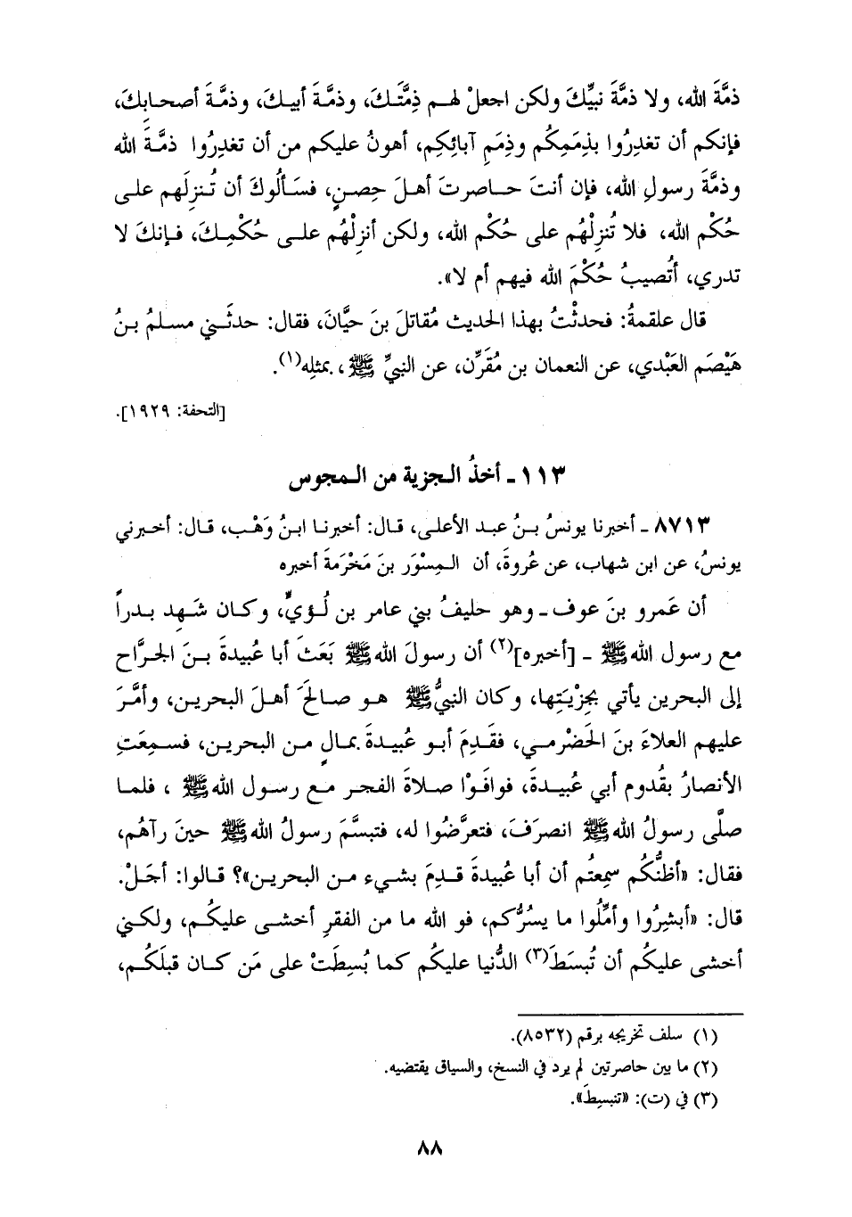 8713 - أَخْبَرَنَا يُونُسُ بْنُ عَبْدِ الْأَعْلَى قَالَ: أَخْبَرَنَا ابْنُ وَهْبٍ قَالَ: أَخْبَرَنِي يُونُسُ، عَنِ ابْنِ شِهَابٍ، عَنْ عُرْوَةَ أَنَّ الْمِسْوَرَ بْنَ مَخْرَمَةَ، أَخْبَرَهُ أَنَّ عَمْرَو بْنَ عَوْفٍ وَهُوَ حَلِيفُ بَنِي عَمَّارِ بْنِ لُؤَيٍّ وَكَانَ §شَهِدَ بَدْرًا مَعَ رَسُولِ اللهِ صَلَّى اللهُ عَلَيْهِ وَسَلَّمَ أَخْبَرَهُ أَنَّ رَسُولَ اللهِ صَلَّى اللهُ عَلَيْهِ وَسَلَّمَ بَعَثَ أَبَا عُبَيْدَةَ بْنَ الْجَرَّاحِ إِلَى الْبَحْرَيْنِ يَأْتِي بِجِزْيَتِهَا، وَكَانَ النَّبِيُّ صَلَّى اللهُ عَلَيْهِ وَسَلَّمَ هُوَ صَالَحَ أَهْلَ الْبَحْرَيْنِ وَأَمَّرَ عَلَيْهِمُ الْعَلَاءَ بْنَ الْحَضْرَمِيِّ فَقَدِمَ أَبُو عُبَيْدٍ بِمَالٍ مِنَ الْبَحْرَيْنِ فَسَمِعَتِ الْأَنْصَارُ بِقُدُومِ أَبِي عُبَيْدَةَ فَوَافَوْا صَلَاةَ الْفَجْرِ مَعَ رَسُولِ اللهِ صَلَّى اللهُ عَلَيْهِ وَسَلَّمَ، فَلَمَّا صَلَّى رَسُولُ اللهِ صَلَّى اللهُ عَلَيْهِ وَسَلَّمَ انْصَرَفَ فَتَعَرَّضُوا لَهُ، فَتَبَسَّمَ رَسُولُ اللهِ صَلَّى اللهُ عَلَيْهِ وَسَلَّمَ حِينَ رَآهُمْ فَقَالَ: «أَظُنُّكُمْ سَمِعْتُمْ أَنَّ أَبَا عُبَيْدَةَ قَدِمَ بِشَيْءٍ مِنَ الْبَحْرَيْنِ؟» قَالُوا: أَجَلْ قَالَ: «أَبْشِرُوا وَأَمِّلُوا مَا يَسُرُّكُمْ، فَوَاللهِ مَا مِنَ الْفَقْرِ أَخْشَى عَلَيْكُمْ، وَلَكِنِّي أَخْشَى عَلَيْكُمْ أَنْ تُبْسَطَ الدُّنْيَا عَلَيْكُمْ كَمَا بُسِطَتْ عَلَى مَنْ كَانَ قَبْلَكُمْ، فَتَنَافَسُوا فِيهَا كَمَا تَنَافَسُوا وَتُهْلِكُكُمْ كَمَا أَهْلَكَتْهُمْ»