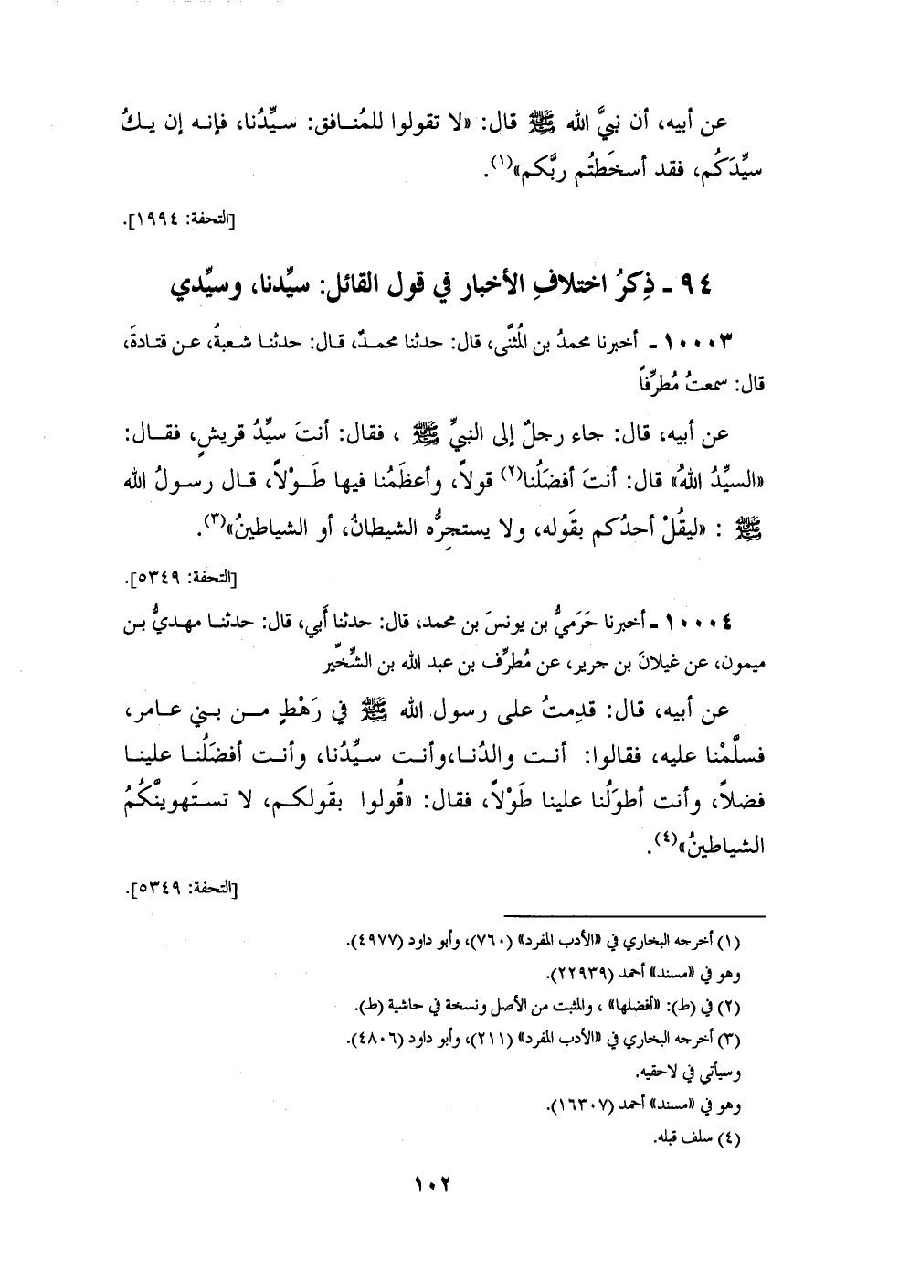 10004 - أَخْبَرَنَا حَرَمِيُّ بْنُ يُونُسَ بْنِ مُحَمَّدٍ قَالَ: حَدَّثَنَا أَبِي قَالَ: حَدَّثَنَا مَهْدِيُّ بْنُ مَيْمُونٍ، عَنْ غَيْلَانَ بْنِ جَرِيرٍ، عَنْ مُطَرِّفِ بْنِ عَبْدِ اللهِ بْنِ الشِّخِّيرِ، عَنْ أَبِيهِ قَالَ: قَدِمْتُ عَلَى رَسُولِ اللهِ صَلَّى اللهُ عَلَيْهِ وَسَلَّمَ فِي رَهْطٍ مِنْ بَنِي عَامِرٍ، فَسَلَّمْنَا عَلَيْهِ، فَقَالُوا: أَنْتَ وَالِدُنَا، وَأَنْتَ سَيِّدُنَا، وَأَنْتَ أَفْضَلُنَا عَلَيْنَا فَضْلًا، وَأَنْتَ أَطْوَلُنَا عَلَيْنَا طُولًا فَقَالَ: «§قُولُوا بِقَوْلِكُمْ لَا تَسْتَهْوِيَنَّكُمُ الشَّيَاطِينُ»