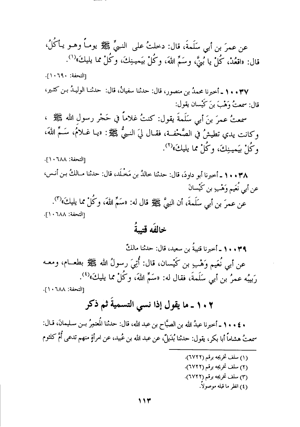 10038 - أَخْبَرَنَا أَبُو دَاوُدَ قَالَ: حَدَّثَنَا خَالِدُ بْنُ مَخْلَدٍ قَالَ: حَدَّثَنَا مَالِكُ بْنُ أَنَسٍ، عَنْ أَبِي نُعَيْمٍ وَهْبِ بْنِ كَيْسَانَ، عَنْ عُمَرَ بْنِ أَبِي سَلَمَةَ: أَنَّ النَّبِيَّ صَلَّى اللهُ عَلَيْهِ وَسَلَّمَ قَالَ لَهُ: «§سَمِّ اللهَ، وَكُلْ مِمَّا يَلِيكَ» خَالَفَهُ قُتَيْبَةُ