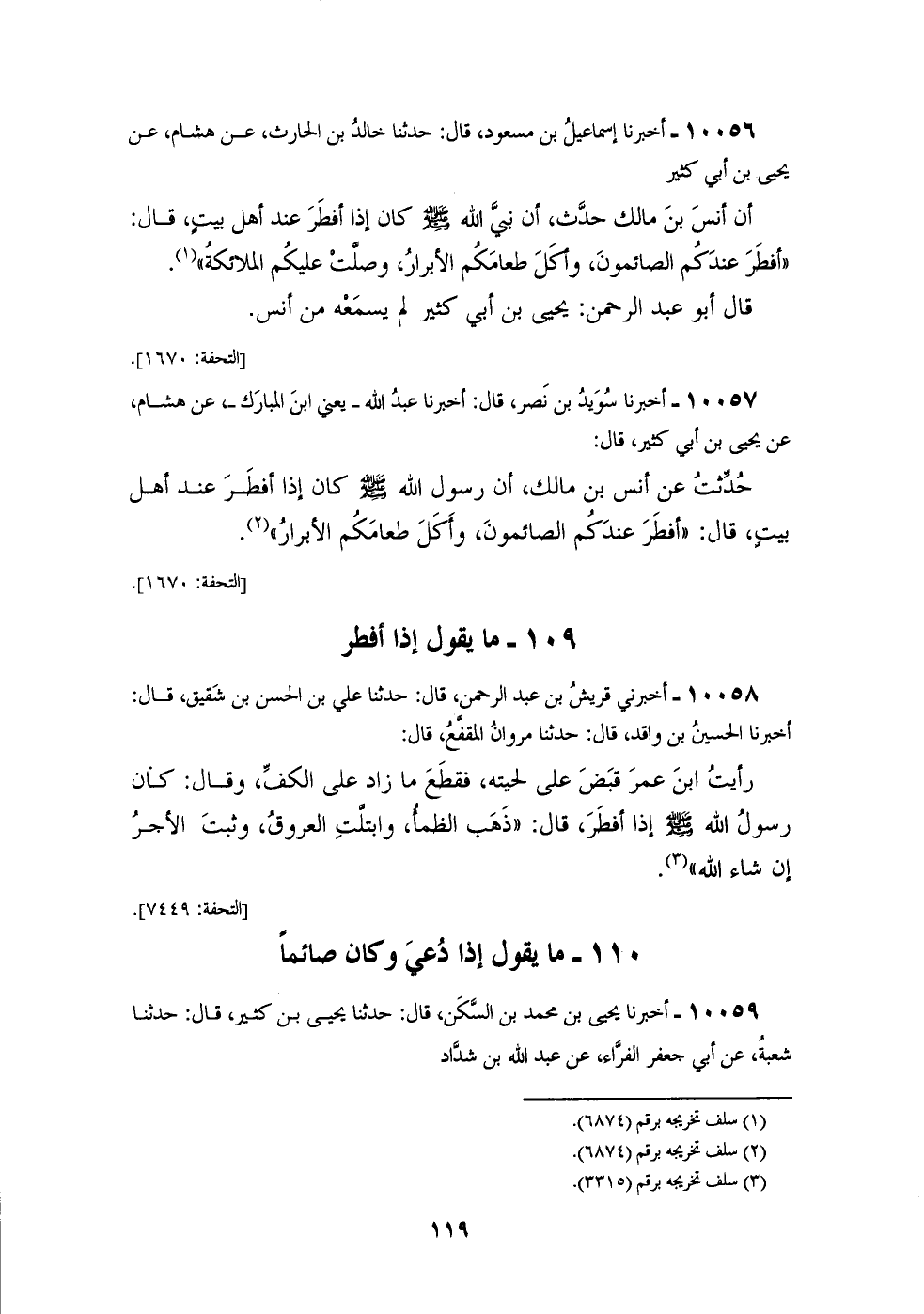 10057 - أَخْبَرَنَا سُوَيْدُ بْنُ نَصْرٍ قَالَ: أَخْبَرَنَا عَبْدُ اللهِ يَعْنِي ابْنَ الْمُبَارَكِ، عَنْ هِشَامٍ، عَنْ يَحْيَى بْنِ أَبِي كَثِيرٍ قَالَ: حَدَّثْتُ عَنْ أَنَسِ بْنِ مَالِكٍ: أَنَّ رَسُولَ اللهِ صَلَّى اللهُ عَلَيْهِ وَسَلَّمَ كَانَ إِذَا أَفْطَرَ عِنْدَ أَهْلِ بَيْتٍ قَالَ: «§أَفْطَرَ عِنْدَكُمُ الصَّائِمُونَ، وَأَكَلَ طَعَامَكُمُ الْأَبْرَارُ»