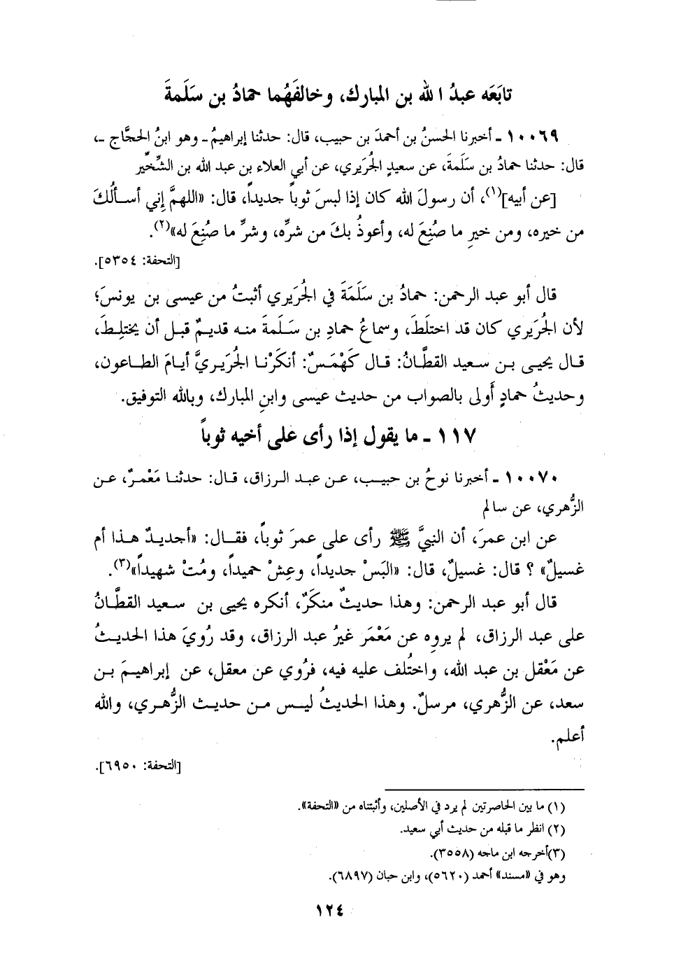 10069 - أَخْبَرَنَا الْحَسَنُ بْنُ أَحْمَدَ بْنِ حَبِيبٍ قَالَ: حَدَّثَنَا إِبْرَاهِيمُ وَهُوَ ابْنُ الْحَجَّاجِ قَالَ: حَدَّثَنَا حَمَّادُ بْنُ سَلَمَةَ، عَنْ سَعِيدٍ الْجُرَيْرِيِّ، عَنْ أَبِي الْعَلَاءِ بْنِ عَبْدِ اللهِ بْنِ الشِّخِّيرِ عَنْ أَبِيهِ: أَنَّ رَسُولَ اللهِ كَانَ إِذَا لَبِسَ ثَوْبًا جَدِيدًا قَالَ: «§اللهُمَّ إِنِّي أَسْأَلُكَ مِنْ خَيْرِهِ وَمَنْ خَيْرِ مَا صُنِعَ لَهُ، وَأَعُوذُ بِكَ مِنْ شَرِّهِ وَشَرِّ مَا صُنِعَ لَهُ» قَالَ أَبُو عَبْدِ الرَّحْمَنِ: حَمَّادُ بْنُ سَلَمَةَ فِي الْجُرَيْرِيِّ أَثْبَتُ مِنْ عِيسَى بْنِ يُونُسَ، لَأَنَّ الْجُرَيْرِيَّ كَانَ قَدِ اخْتَلَطَ، وَسَمَاعُ حَمَّادِ بْنِ سَلَمَةَ مِنْهُ قَدِيمٌ قَبْلَ أَنْ يَخْتَلِطَ قَالَ يَحْيَى بْنُ سَعِيدٍ الْقَطَّانُ: قَالَ كَهْمَسٌ: أَنْكَرْنَا الْجُرَيْرِيَّ أَيَّامَ الطَّاعُونِ، وَحَدِيثُ حَمَّادٍ أَوْلَى بِالصَّوَابِ مِنْ حَدِيثِ عِيسَى وَابْنِ الْمُبَارَكِ، وَبِاللهِ التَّوْفِيقُ