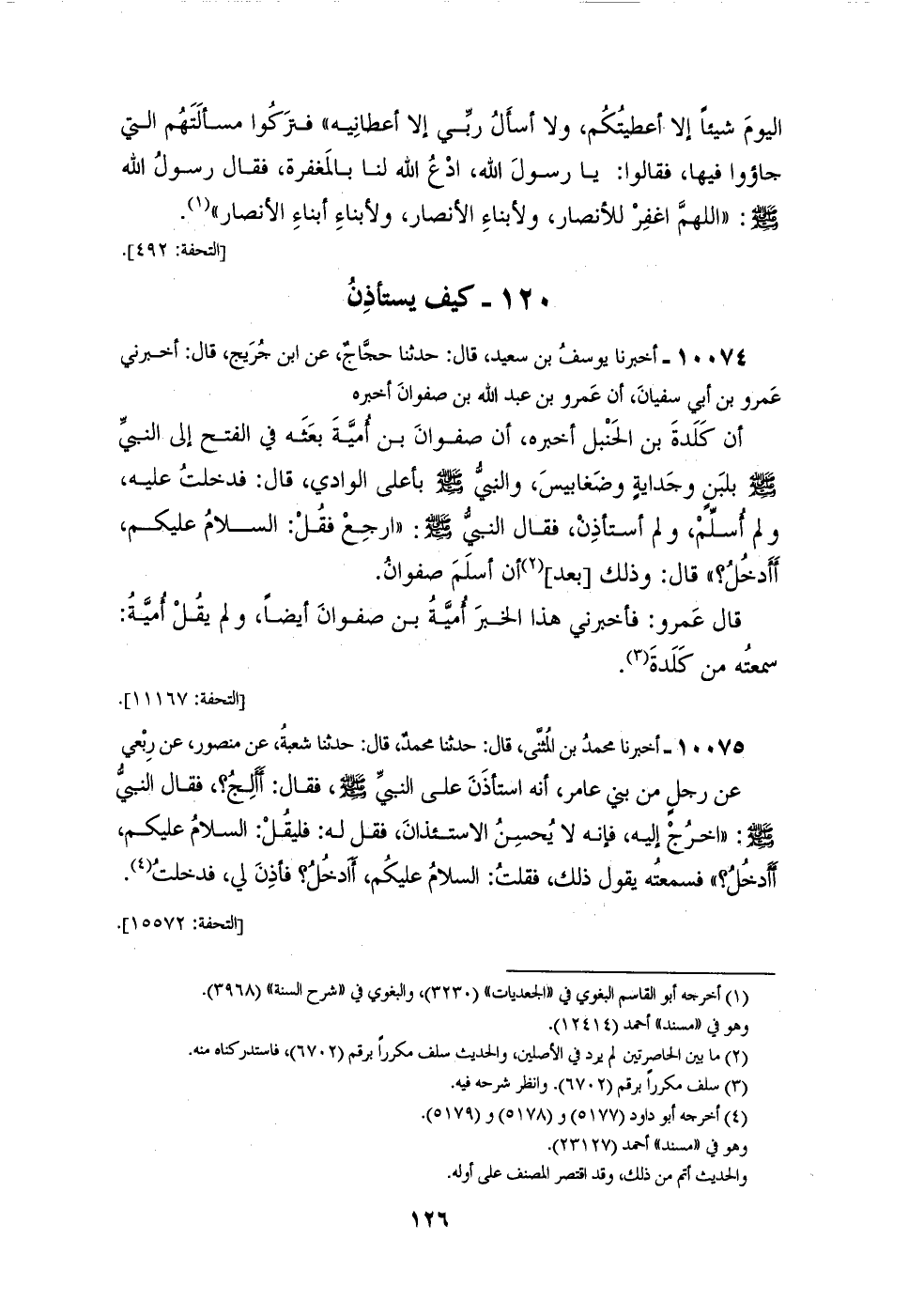 10074 - أَخْبَرَنَا يُوسُفُ بْنُ سَعِيدٍ قَالَ: حَدَّثَنَا حَجَّاجٌ، عَنِ ابْنِ جُرَيْجٍ قَالَ: أَخْبَرَنِي عَمْرُو بْنُ أَبِي سُفْيَانَ: أَنَّ عَمْرَو بْنَ عَبْدِ اللهِ بْنِ صَفْوَانَ، أَخْبَرَهُ أَنَّ كَلَدَةَ بْنَ الْحَنْبَلِ أَخْبَرَهُ: أَنَّ صَفْوَانَ بْنَ أُمَيَّةَ بَعَثَهُ فِي الْفَتْحِ إِلَى النَّبِيِّ صَلَّى اللهُ عَلَيْهِ وَسَلَّمَ بِلَبَنٍ وَجَدَايَةٍ وَضَغَابِيسَ، وَالنَّبِيُّ صَلَّى اللهُ عَلَيْهِ وَسَلَّمَ بِأَعْلَى الْوَادِي قَالَ: فَدَخَلْتُ عَلَيْهِ وَلَمْ أُسَلِّمْ وَلَمْ أَسْتَأْذِنْ فَقَالَ النَّبِيُّ صَلَّى اللهُ عَلَيْهِ وَسَلَّمَ: " §ارْجِعْ فَقُلِ: السَّلَامُ عَلَيْكُمْ أَأَدْخُلُ؟ " قَالَ وَذَلِكَ بَعْدَ أَنْ أَسْلَمَ صَفْوَانُ قَالَ عَمْرٌو: فَأَخْبَرَنِي هَذَا الْخَبَرَ أُمَيَّةُ بْنُ صَفْوَانَ أَيْضًا، وَلَمْ يَقُلْ أُمَيَّةُ: سَمِعْتُهُ مِنْ كَلَدَةَ