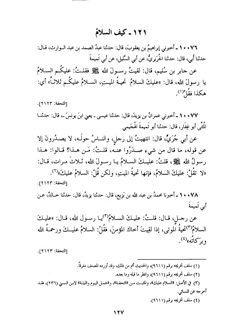 10076 - أَخْبَرَنِي إِبْرَاهِيمُ بْنُ يَعْقُوبَ قَالَ: حَدَّثَنَا عَبْدُ الصَّمَدِ بْنُ عَبْدِ الْوَارِثِ قَالَ: حَدَّثَنَا أَبِي قَالَ: حَدَّثَنَا الْجُرَيْرِيُّ، عَنْ أَبِي السَّلِيلِ، عَنْ أَبِي تَمِيمَةَ، عَنْ جَابِرِ بْنِ سُلَيْمٍ قَالَ: لَقِيتُ رَسُولَ اللهِ صَلَّى اللهُ عَلَيْهِ وَسَلَّمَ فَقُلْتُ: عَلَيْكُمُ السَّلَامُ يَا رَسُولَ اللهِ قَالَ: «§عَلَيْكَ السَّلَامُ، تَحِيَّةُ الْمَيِّتِ، السَّلَامُ عَلَيْكُمْ» ثَلَاثًا، أَيْ هَكَذَا فَقُلْ