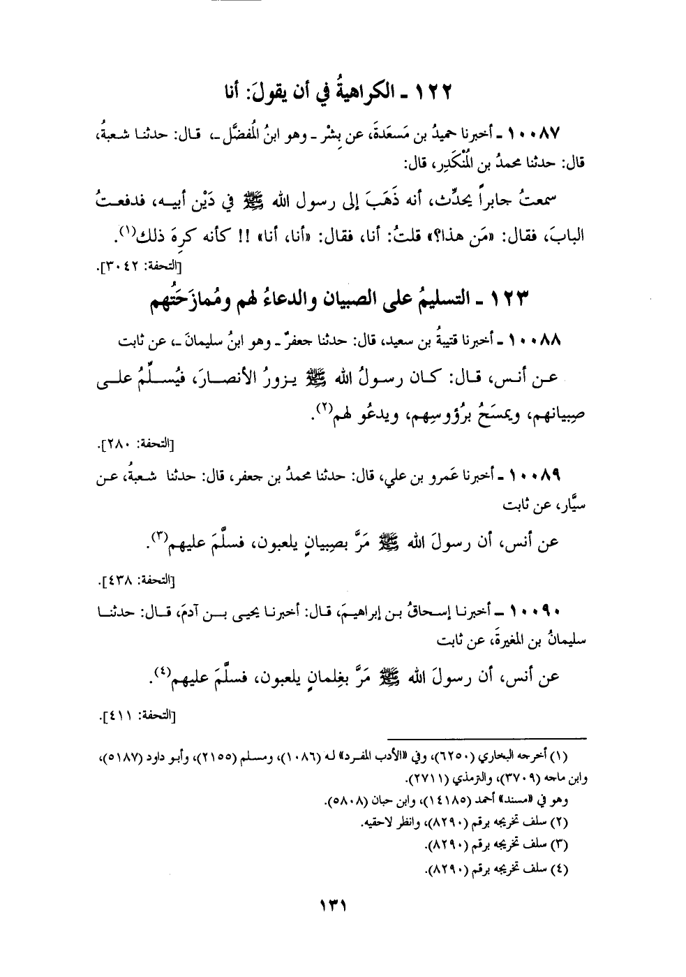 10089 - أَخْبَرَنَا عَمْرُو بْنُ عَلِيٍّ قَالَ: حَدَّثَنَا مُحَمَّدُ بْنُ جَعْفَرٍ قَالَ: حَدَّثَنَا شُعْبَةُ، عَنْ سَيَّارٍ، عَنْ ثَابِتٍ، عَنْ أَنَسٍ: «أَنَّ رَسُولَ اللهِ صَلَّى اللهُ عَلَيْهِ وَسَلَّمَ §مَرَّ بِصِبْيَانٍ يَلْعَبُونَ فَسَلَّمَ عَلَيْهِمْ»