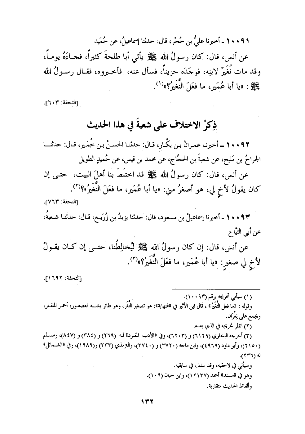 10091 - أَخْبَرَنَا عَلِيُّ بْنُ حُجْرٍ قَالَ: حَدَّثَنَا إِسْمَاعِيلُ، عَنْ حُمَيْدٍ، عَنْ أَنَسٍ قَالَ: كَانَ رَسُولُ اللهِ صَلَّى اللهُ عَلَيْهِ وَسَلَّمَ يَأْتِي أَبَا طَلْحَةَ كَثِيرًا، فَجَاءَهُ يَوْمًا وَقَدْ مَاتَ نُغَيرٌ لِابْنِهِ، فَوَجَدَهُ حَزِينًا فَسَأَلَ عَنْهُ، فَأَخْبَرُوهُ فَقَالَ رَسُولُ اللهِ صَلَّى اللهُ عَلَيْهِ وَسَلَّمَ: «§يَا أَبَا عُمَيْرٍ، مَا فَعَلَ النُّغَيْرُ؟»