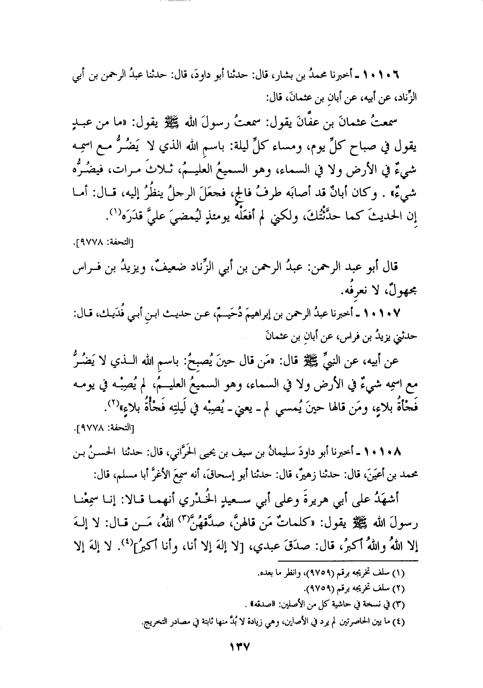 10106 - أَخْبَرَنَا مُحَمَّدُ بْنُ بَشَّارٍ قَالَ: حَدَّثَنَا أَبُو دَاوُدَ قَالَ: حَدَّثَنَا عَبْدُ الرَّحْمَنِ بْنُ أَبِي الزِّنَادِ، عَنْ أَبِيهِ، عَنْ أَبَانَ بْنِ عُثْمَانَ قَالَ: سَمِعْتُ عُثْمَانَ بْنَ عَفَّانَ، يَقُولُ: سَمِعْتُ رَسُولَ اللهِ صَلَّى اللهُ عَلَيْهِ وَسَلَّمَ يَقُولُ: " §مَا مِنْ عَبْدٍ يَقُولُ فِي صَبَاحِ كُلِّ يَوْمٍ وَمَسَاءِ كُلِّ لَيْلَةٍ: بِسْمِ اللهِ الَّذِي لَا يَضُرُّ مَعَ اسْمِهِ شَيْءٌ فِي الْأَرْضِ وَلَا فِي السَّمَاءِ وَهُوَ السَّمِيعُ الْعَلِيمُ ثَلَاثَ مَرَّاتٍ فَيَضُرُّهُ شَيْءٌ " وَكَانَ أَبَانُ قَدْ أَصَابَهُ طَرَفُ فَالِجٍ، فَجَعَلَ الرَّجُلُ يَنْظُرُ إِلَيْهِ قَالَ: أَمَا إِنَّ الْحَدِيثَ كَمَا حَدَّثْتُكَ، وَلَكِنِّي لَمْ أَفْعَلْهُ يَوْمَئِذٍ، لِيَمْضِيَ عَلَى قَدَرِهِ. قَالَ أَبُو عَبْدِ الرَّحْمَنِ: عَبْدُ الرَّحْمَنِ بْنُ أَبِي الزِّنَادِ ضَعِيفٌ، وَيَزِيدُ بْنُ فِرَاسٍ مَجْهُولٌ، لَا نَعْرِفُهُ