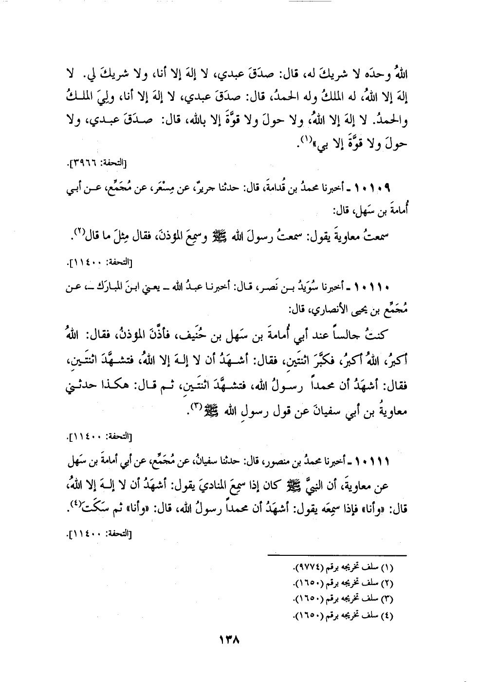 10110 - أَخْبَرَنَا سُوَيْدُ بْنُ نَصْرٍ قَالَ: أَخْبَرَنَا عَبْدُ اللهِ يَعْنِي ابْنَ الْمُبَارَكِ، عَنْ مُجَمِّعِ بْنِ يَحْيَى الْأَنْصَارِيِّ قَالَ: §كُنْتُ جَالِسًا عِنْدَ أَبِي أُمَامَةَ بْنِ سَهْلِ بْنِ حُنَيْفٍ، فَأَذَّنَ الْمُؤَذِّنُ فَقَالَ: اللهُ أَكْبَرُ اللهُ أَكْبَرُ، فَكَبَّرَ اثْنَتَيْنِ، فَقَالَ: أَشْهَدُ أَنْ لَا إِلَهَ إِلَّا اللهُ، فَتَشَهَّدَ اثْنَتَيْنِ، فَقَالَ: أَشْهَدُ أَنَّ مُحَمَّدًا رَسُولُ اللهِ، فَتَشَهَّدَ اثْنَتَيْنِ، ثُمَّ قَالَ: هَكَذَا حَدَّثَنِي مُعَاوِيَةُ بْنُ أَبِي سُفْيَانَ، عَنْ قَوْلِ رَسُولِ اللهِ صَلَّى اللهُ عَلَيْهِ وَسَلَّمَ