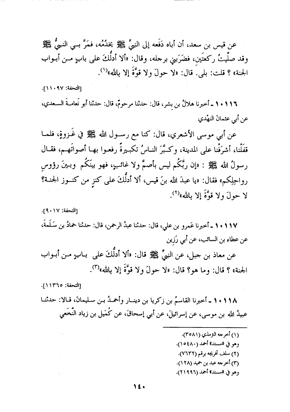 10116 - أَخْبَرَنَا هِلَالُ بْنُ بِشْرٍ قَالَ: حَدَّثَنَا مَرْحُومٌ قَالَ: حَدَّثَنَا أَبُو نَعَامَةَ السَّعْدِيُّ، عَنْ أَبِي عُثْمَانَ النَّهْدِيِّ، عَنْ أَبِي مُوسَى الْأَشْعَرِيِّ قَالَ: كُنَّا مَعَ رَسُولِ اللهِ صَلَّى اللهُ عَلَيْهِ وَسَلَّمَ فِي غَزْوَةٍ، فَلَمَّا قَفَلْنَا أَشْرَفْنَا عَلَى الْمَدِينَةِ، وَكَبَّرَ النَّاسُ تَكْبِيرَةً رَفَعُوا بِهَا أَصْوَاتَهُمْ، فَقَالَ رَسُولُ اللهِ صَلَّى اللهُ عَلَيْهِ وَسَلَّمَ: «إِنَّ رَبَّكُمْ لَيْسَ بِأَصَمَّ وَلَا غَائِبَ، فَهُوَ بَيْنَكُمْ وَبَيْنَ رُءُوسِ رَوَاحِلِكُمْ» فَقَالَ: " يَا عَبْدَ اللهِ بْنَ قَيْسٍ، §أَلَا أَدُلُّكَ عَلَى كَنْزٍ مِنْ كُنُوزِ الْجَنَّةِ: لَا حَوْلَ وَلَا قُوَّةَ إِلَّا بِاللهِ "