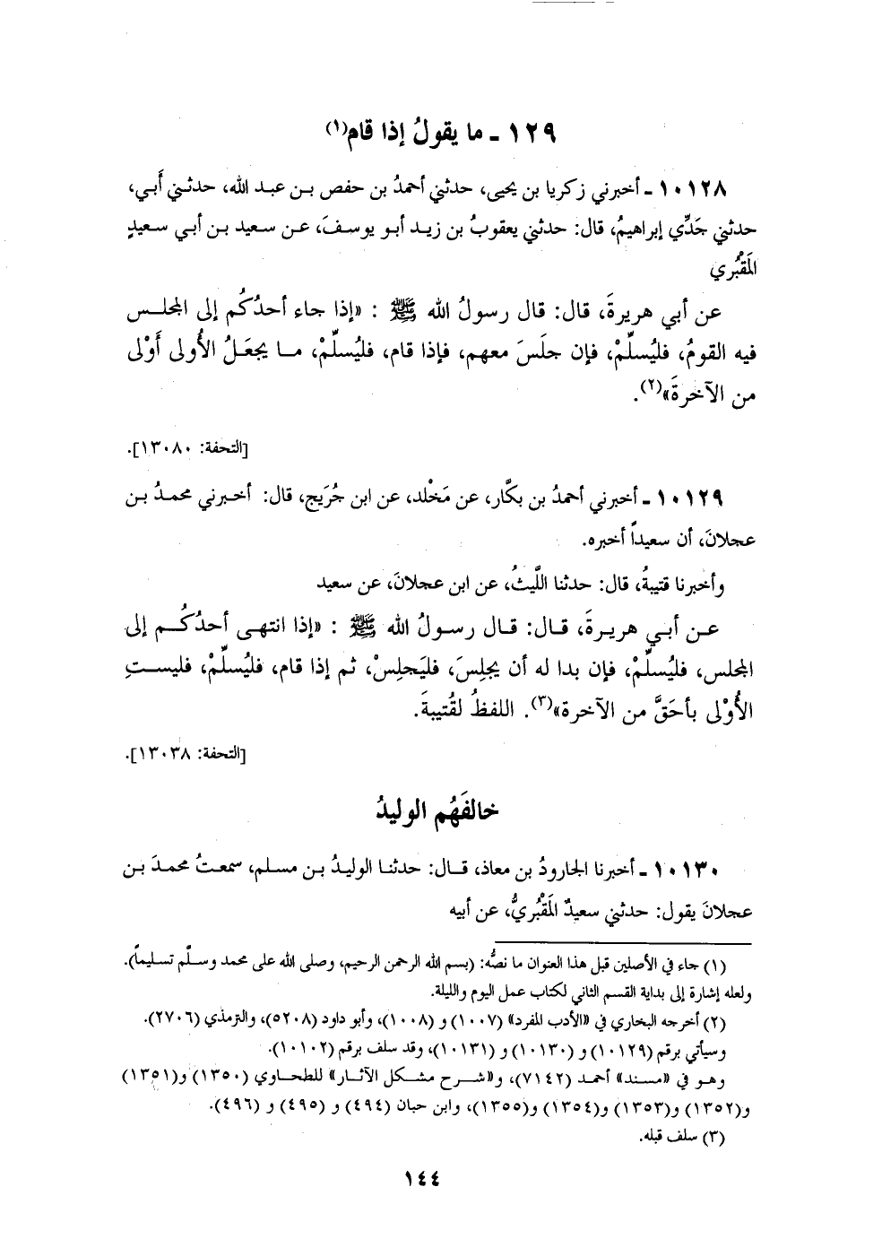 10130 - أَخْبَرَنَا الْجَارُودُ بْنُ مُعَاذٍ قَالَ: حَدَّثَنَا الْوَلِيدُ بْنُ مُسْلِمٍ، سَمِعْتُ مُحَمَّدَ بْنَ عَجْلَانَ، يَقُولُ: حَدَّثَنِي سَعِيدٌ الْمَقْبُرِيُّ، عَنْ أَبِيهِ، عَنْ أَبِي هُرَيْرَةَ قَالَ: قَالَ رَسُولُ اللهِ صَلَّى اللهُ عَلَيْهِ وَسَلَّمَ: «§إِذَا قَعَدَ أَحَدُكُمْ فَلْيُسَلِّمْ، وَإِذَا قَامَ فَلْيُسَلِّمْ، فَلَيْسَتِ الْأُولَى بِأَحَقَّ مِنَ الْآخِرَةِ»