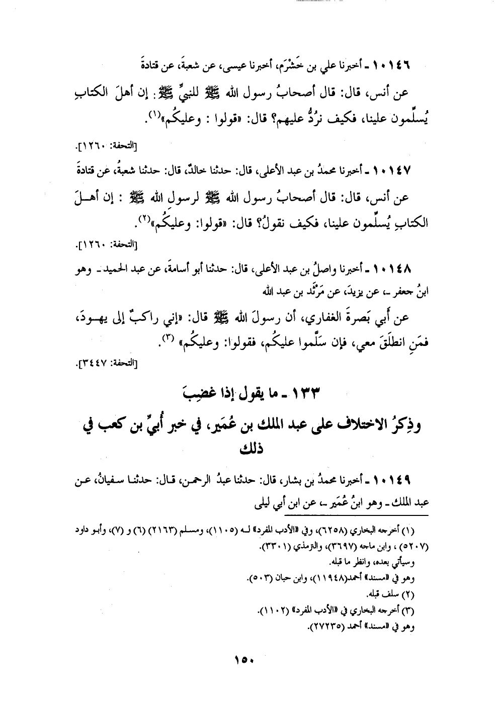 10146 - أَخْبَرَنَا عَلِيُّ بْنُ خَشْرَمٍ، أَخْبَرَنَا عِيسَى، عَنْ شُعْبَةَ، عَنْ قَتَادَةَ، عَنْ أَنَسٍ قَالَ: قَالَ أَصْحَابُ رَسُولِ اللهِ صَلَّى اللهُ عَلَيْهِ وَسَلَّمَ لِلنَّبِيِّ صَلَّى اللهُ عَلَيْهِ وَسَلَّمَ: §إِنَّ أَهْلَ الْكِتَابِ يُسَلِّمُونَ عَلَيْنَا، فَكَيْفَ نَرُدُّ عَلَيْهِمْ؟ قَالَ: " قُولُوا: وَعَلَيْكُمْ "
