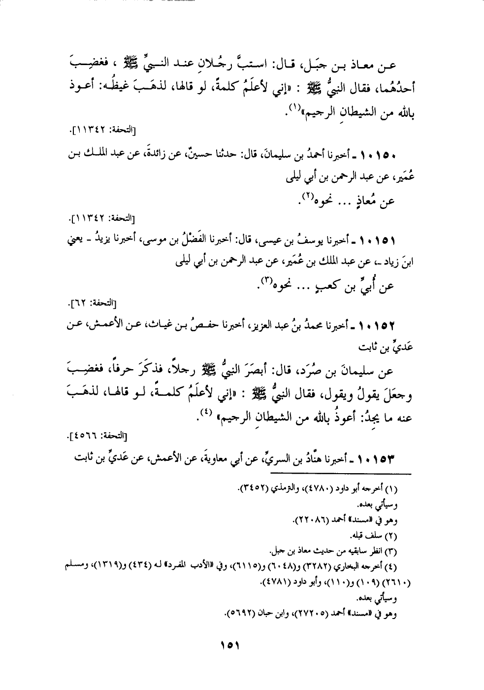10152 - أَخْبَرَنَا مُحَمَّدُ بْنُ عَبْدِ الْعَزِيزِ، أَخْبَرَنَا حَفْصُ بْنُ غِيَاثٍ، عَنِ الْأَعْمَشِ، عَنْ عَدِيِّ بْنِ ثَابِتٍ، عَنْ سُلَيْمَانَ بْنِ صُرَدٍ قَالَ: أَبْصَرَ النَّبِيُّ صَلَّى اللهُ عَلَيْهِ وَسَلَّمَ رَجُلًا، فَذَكَرَ حَرْفًا فَغَضِبَ وَجَعَلَ يَقُولُ وَيَقُولُ، فَقَالَ النَّبِيُّ صَلَّى اللهُ عَلَيْهِ وَسَلَّمَ: " §إِنِّي لَأَعْلَمُ كَلِمَةً لَوْ قَالَهَا لَذَهَبَ عَنْهُ مَا يَجِدُ: أَعُوذُ بِاللهِ مِنَ الشَّيْطَانِ الرَّجِيمِ "