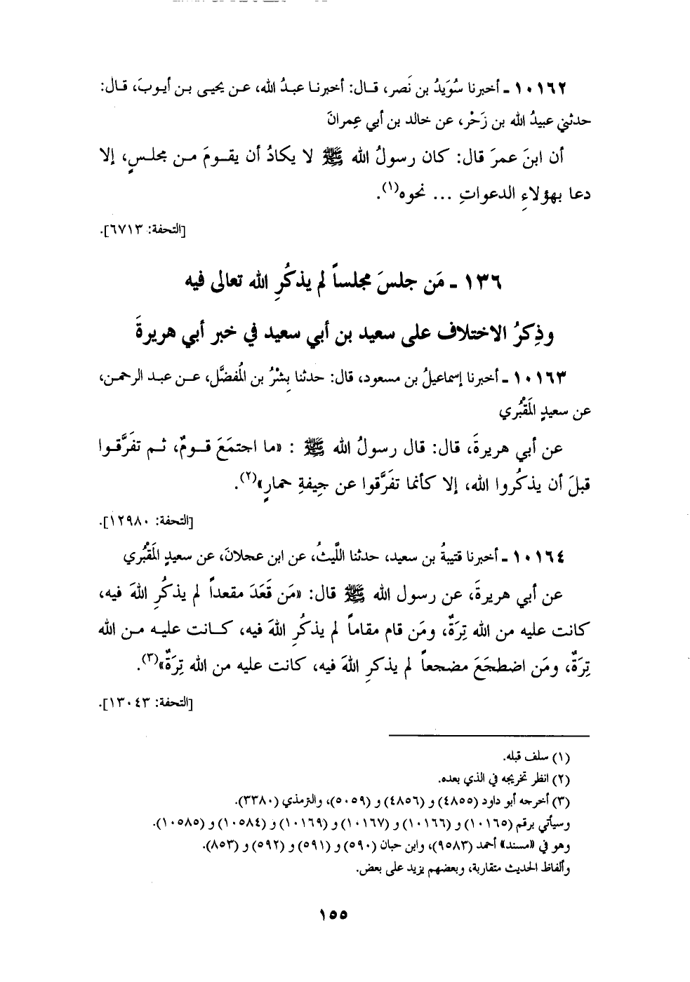 10164 - أَخْبَرَنَا قُتَيْبَةُ بْنُ سَعِيدٍ، حَدَّثَنَا اللَّيْثُ، عَنِ ابْنِ عَجْلَانَ، عَنْ سَعِيدٍ الْمَقْبُرِيِّ، عَنْ أَبِي هُرَيْرَةَ، عَنْ رَسُولِ اللهِ صَلَّى اللهُ عَلَيْهِ وَسَلَّمَ قَالَ: «§مَنْ قَعَدَ مَقْعَدًا لَمْ يَذْكُرِ اللهَ فِيهِ كَانَتْ عَلَيْهِ مِنَ اللهِ تِرَةٌ، وَمَنْ قَامَ مَقَامًا لَمْ يَذْكُرِ اللهَ فِيهِ كَانَتْ عَلَيْهِ مِنَ اللهِ تِرَةٌ، وَمَنِ اضْطَجَعَ مَضْجَعًا لَمْ يَذْكُرِ اللهَ فِيهِ كَانَتْ عَلَيْهِ مِنَ اللهِ تِرَةٌ»