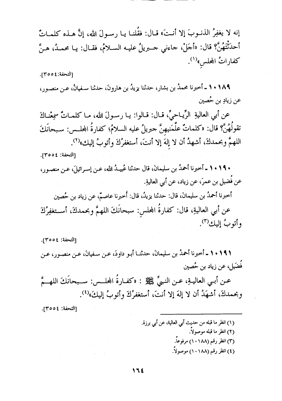 10189 - أَخْبَرَنَا مُحَمَّدُ بْنُ بَشَّارٍ، حَدَّثَنَا يَزِيدُ بْنُ هَارُونَ، حَدَّثَنَا سُفْيَانُ، عَنْ مَنْصُورٍ، عَنْ زِيَادِ بْنِ حَصِينٍ، عَنْ أَبِي الْعَالِيَةِ الرِّيَاحِيِّ قَالَ: قَالُوا: يَا رَسُولَ اللهِ، مَا كَلِمَاتٌ سَمِعْنَاكَ تَقُولُهُنَّ؟ قَالَ: " §كَلِمَاتٌ عَلَّمَنِيهِنَّ جِبْرِيلُ عَلَيْهِ السَّلَامُ، كَفَّارَةُ الْمَجْلِسِ: سُبْحَانَكَ اللهُمَّ وَبِحَمْدِكَ، أَشْهَدُ أَنْ لَا إِلَهَ إِلَّا أَنْتَ، أَسْتَغْفِرُكَ وَأَتُوبُ إِلَيْكَ ".