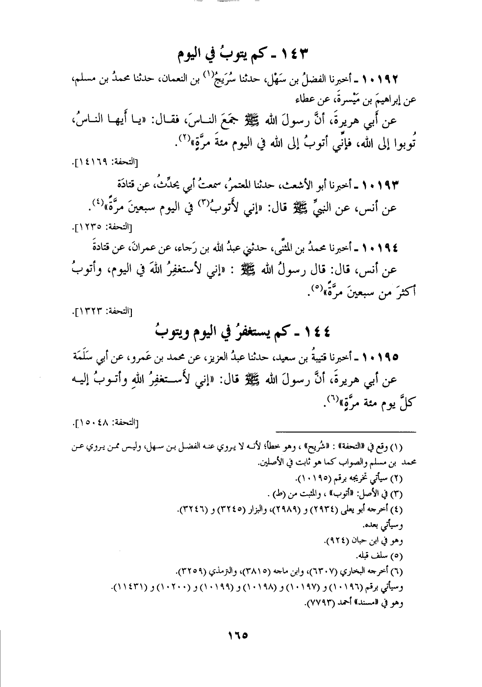 10193 - أَخْبَرَنَا أَبُو الْأَشْعَثِ، حَدَّثَنَا الْمُعْتَمِرُ، سَمِعْتُ أَبِي يُحَدِّثُ، عَنْ قَتَادَةَ، عَنْ أَنَسٍ، عَنِ النَّبِيِّ صَلَّى اللهُ عَلَيْهِ وَسَلَّمَ قَالَ: «§إِنِّي لَأَتُوبُ فِي الْيَوْمِ سَبْعِينَ مَرَّةً»