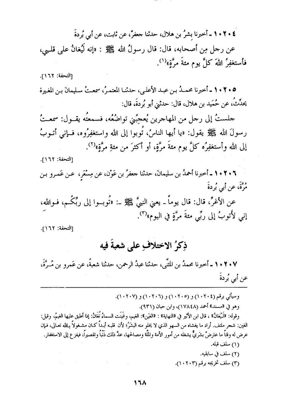10204 - أَخْبَرَنَا بِشْرُ بْنُ هِلَالٍ، حَدَّثَنَا جَعْفَرٌ، عَنْ ثَابِتٍ، عَنْ أَبِي بُرْدَةَ، عَنْ رَجُلٍ مِنْ أَصْحَابِهِ قَالَ: قَالَ رَسُولُ اللهِ صَلَّى اللهُ عَلَيْهِ وَسَلَّمَ: «§إِنَّهُ لَيُغَانُ عَلَى قَلْبِي فَأَسْتَغْفِرُ اللهَ كُلَّ يَوْمٍ مِائَةَ مَرَّةٍ»