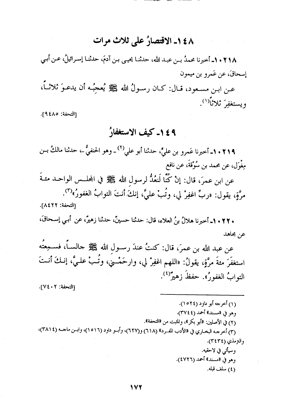 10218 - أَخْبَرَنَا مُحَمَّدُ بْنُ عَبْدِ اللهِ، حَدَّثَنَا يَحْيَى بْنُ آدَمَ، حَدَّثَنَا إِسْرَائِيلُ، عَنْ أَبِي إِسْحَاقَ، عَنْ عَمْرِو بْنِ مَيْمُونٍ، عَنِ ابْنِ مَسْعُودٍ قَالَ: «§كَانَ رَسُولُ اللهِ صَلَّى اللهُ عَلَيْهِ وَسَلَّمَ يُعْجِبُهُ أَنْ يَدْعُوَ ثَلَاثًا، وَيَسْتَغْفِرَ ثَلَاثًا»