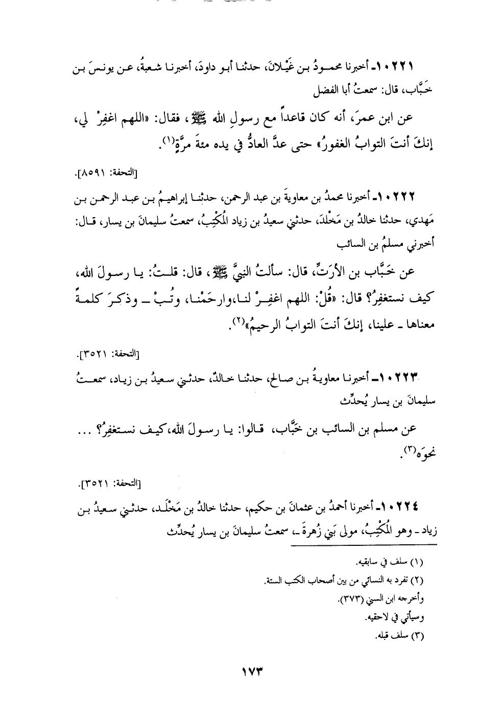 10223 - أَخْبَرَنَا مُعَاوِيَةُ بْنُ صَالِحٍ، حَدَّثَنَا خَالِدٌ، حَدَّثَنِي سَعِيدُ بْنُ زِيَادٍ، سَمِعْتُ سُلَيْمَانَ بْنَ يَسَارٍ يُحَدِّثُ، عَنْ مُسْلِمِ بْنِ السَّائِبِ بْنِ خَبَّابٍ، قَالُوا: يَا رَسُولَ اللهِ، كَيْفَ نَسْتَغْفُرُ؟ نَحْوَهُ