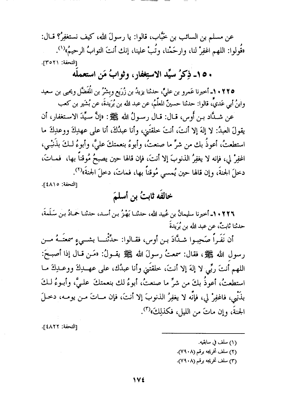 10226 - أَخْبَرَنَا سُلَيْمَانُ بْنُ عُبَيْدِ اللهِ، حَدَّثَنَا بَهْزُ بْنُ أَسَدٍ، حَدَّثَنَا حَمَّادُ بْنُ سَلَمَةَ، حَدَّثَنَا ثَابِتٌ، عَنْ عَبْدِ اللهِ بْنِ بُرَيْدَةَ، أَنَّ نَفَرًا صَحِبُوا شَدَّادَ بْنَ أَوْسٍ فَقَالُوا: حَدِّثْنَا بِشَيْءٍ سَمِعَتَهُ مِنْ رَسُولِ اللهِ صَلَّى اللهُ عَلَيْهِ وَسَلَّمَ، فَقَالَ: سَمِعْتُ رَسُولَ اللهِ صَلَّى اللهُ عَلَيْهِ وَسَلَّمَ يَقُولُ: " §مَنْ قَالَ إِذَا أَصْبَحَ: اللهُمَّ أَنْتَ رَبِّي، لَا إِلَهَ إِلَّا أَنْتَ، خَلَقْتَنِي وَأَنَا عَبْدُكَ، عَلَى عَهْدِكَ وَوَعْدِكَ مَا اسْتَطَعْتُ، أَعُوذُ بِكَ مِنْ شَرِّ مَا صَنَعْتُ، أَبُوءُ لَكَ بِنِعْمَتِكَ عَلَيَّ، وَأَبُوءُ لَكَ بِذَنْبِي، فَاغْفِرْ لِي، فَإِنَّهُ لَا يَغْفِرُ الذُّنُوبَ إِلَّا أَنْتَ، فَإِنْ مَاتَ مِنْ يَوْمِهِ دَخَلَ الْجَنَّةَ، وَإِنْ مَاتَ مِنَ اللَّيْلِ فَكَذَلِكَ " -[175]-. خَالَفَهُ الْوَلِيدُ بْنُ ثَعْلَبَةَ