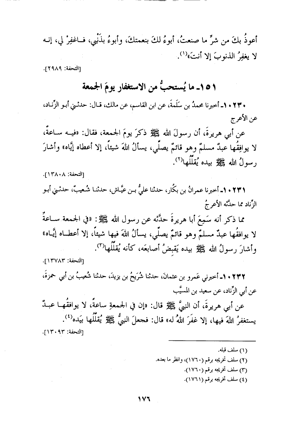 10232 - أَخْبَرَنِي عَمْرُو بْنُ عُثْمَانَ، حَدَّثَنَا شُرَيْحُ بْنُ يَزِيدَ، حَدَّثَنَا شُعَيْبُ بْنُ أَبِي حَمْزَةَ، عَنْ أَبِي الزِّنَادِ، عَنْ سَعِيدِ بْنِ الْمُسَيِّبِ، عَنْ أَبِي هُرَيْرَةَ، أَنَّ النَّبِيَّ صَلَّى اللهُ عَلَيْهِ وَسَلَّمَ قَالَ: «إِنَّ §فِي الْجُمُعَةِ سَاعَةٌ لَا يُوَافِقُهَا عَبْدٌ يَسْتَغْفِرُ اللهَ فِيهَا إِلَّا غَفَرَ اللهُ لَهُ» قَالَ: فَجَعَلَ النَّبِيُّ صَلَّى اللهُ عَلَيْهِ وَسَلَّمَ يُقَلِّلُهَا بِيَدِهِ
