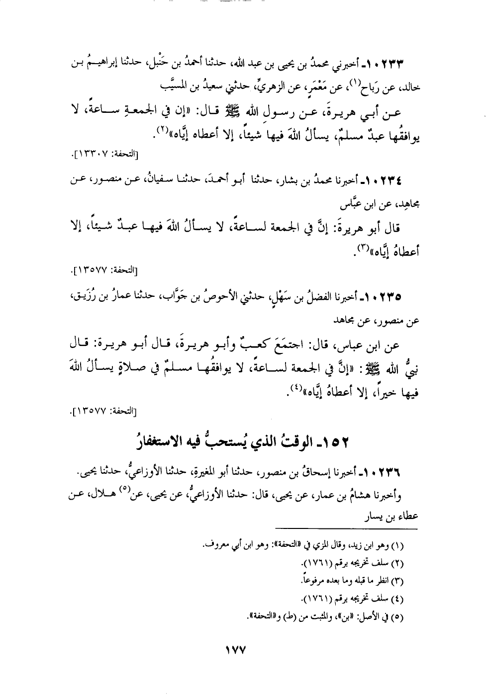 10233 - أَخْبَرَنِي مُحَمَّدُ بْنُ يَحْيَى بْنِ عَبْدِ اللهِ، حَدَّثَنَا أَحْمَدُ بْنُ حَنْبَلٍ، حَدَّثَنَا إِبْرَاهِيمُ بْنُ خَالِدٍ، عَنْ رَبَاحٍ، عَنْ مَعْمَرٍ، عَنِ الزُّهْرِيِّ، حَدَّثَنِي سَعِيدُ بْنُ الْمُسَيِّبِ، عَنْ أَبِي هُرَيْرَةَ، عَنْ رَسُولِ اللهِ صَلَّى اللهُ عَلَيْهِ وَسَلَّمَ قَالَ: «إِنَّ §فِي الْجُمُعَةِ سَاعَةٌ لَا يُوَافِقُهَا عَبْدٌ مُسْلِمٌ يَسْأَلُ اللهَ فِيهَا شَيْئًا إِلَّا أَعْطَاهُ إِيَّاهُ»