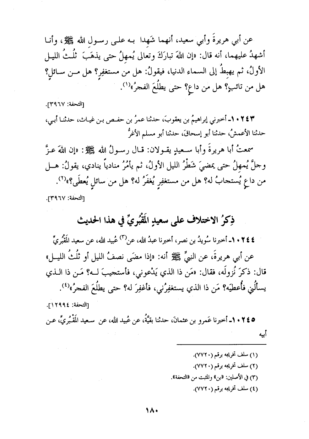 10244 - أَخْبَرَنَا سُوَيْدُ بْنُ نَصْرٍ، أَخْبَرَنَا عَبْدُ اللهِ عَنْ عُبَيْدِ اللهِ، عَنْ سَعِيدٍ الْمَقْبُرِيِّ، عَنْ أَبِي هُرَيْرَةَ، عَنِ النَّبِيِّ صَلَّى اللهُ عَلَيْهِ وَسَلَّمَ: " أَنَّهُ §إِذَا مَضَى نِصْفُ اللَّيْلِ أَوْ ثُلُثُ اللَّيْلِ قَالَ: ذَكَرَ نُزُولَهُ فَقَالَ: مَنْ ذَا الَّذِي يَدْعُونِي فَأَسْتَجِيبَ لَهُ، مَنْ ذَا الَّذِي يَسْأَلُنِي فَأُعْطِيَهِ، مَنْ ذَا الَّذِي يَسْتَغْفِرُنِي فَأَغْفِرَ لَهُ، حَتَّى يَطْلُعَ الْفَجْرُ "