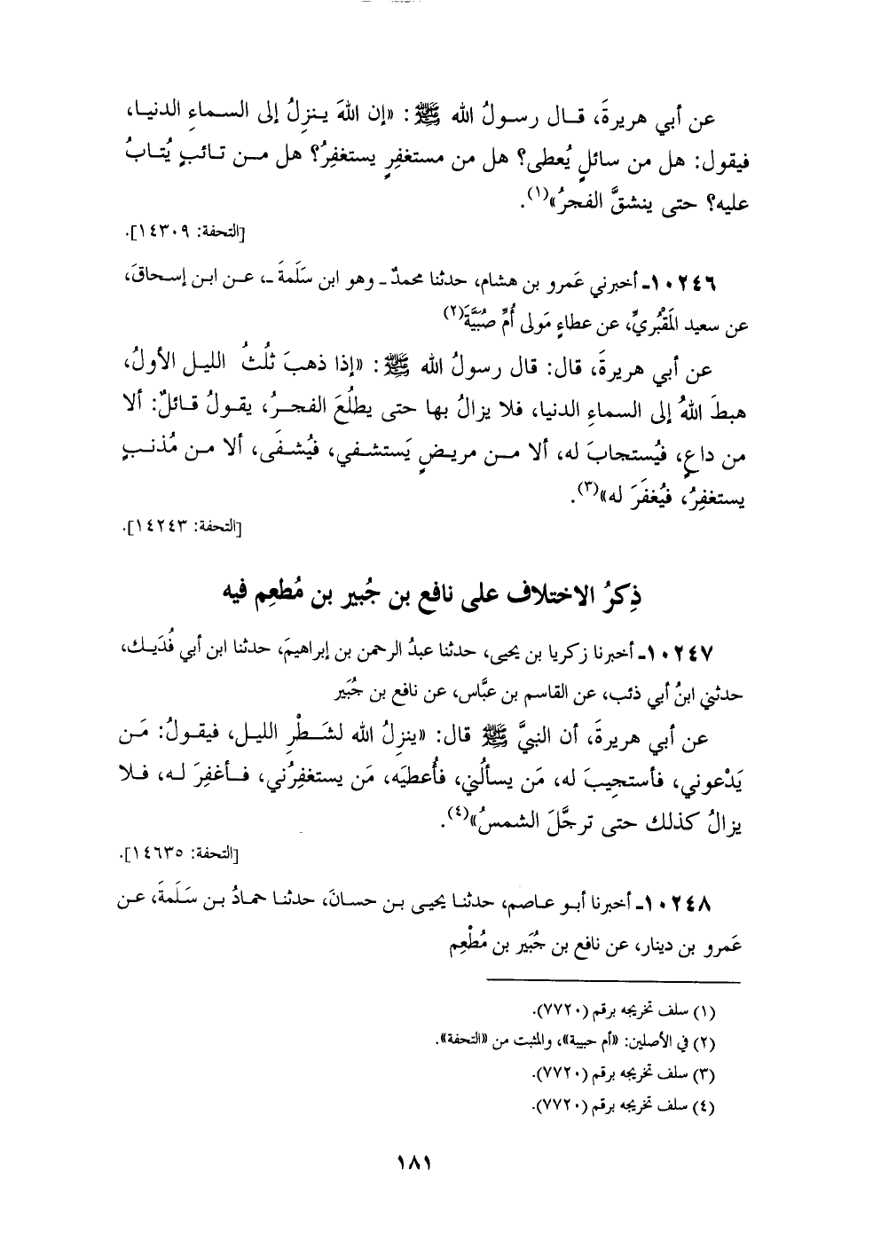 10247 - أَخْبَرَنَا زَكَرِيَّا بْنُ يَحْيَى، حَدَّثَنَا عَبْدُ الرَّحْمَنِ بْنُ إِبْرَاهِيمَ، حَدَّثَنَا ابْنُ أَبِي فُدَيْكٍ، حَدَّثَنِي ابْنُ أَبِي ذِئْبٍ، عَنِ الْقَاسِمِ بْنِ عَبَّاسٍ، عَنْ نَافِعِ بْنِ جُبَيْرٍ، عَنْ أَبِي هُرَيْرَةَ، أَنَّ النَّبِيَّ صَلَّى اللهُ عَلَيْهِ وَسَلَّمَ قَالَ: " §يَنْزِلُ اللهُ لِشَطْرِ اللَّيْلِ فَيَقُولُ: مَنْ يَدْعُونِي فَأَسْتَجِيبَ لَهُ، مِنْ يَسْأَلُنِي فَأُعْطِيَهِ، مَنْ يَسْتَغْفِرُنِي فَأَغْفِرَ لَهُ، فَلَا يَزَالُ كَذَالِكَ حَتَّى تُرَجَّلَ الشَّمْسُ "