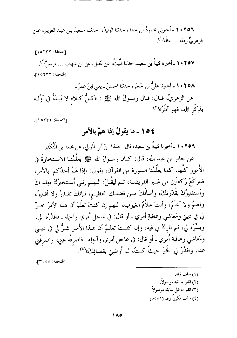 10259 - أَخْبَرَنَا قُتَيْبَةُ بْنُ سَعِيدٍ، قَالَ: حَدَّثَنَا ابْنُ أَبِيُ الْمَوَالِي، عَنْ مُحَمَّدِ بْنِ الْمُنْكَدِرِ، عَنْ جَابِرِ بْنِ عَبْدِ اللهِ، قَالَ: كَانَ رَسُولُ اللهِ صَلَّى اللهُ عَلَيْهِ وَسَلَّمَ يُعَلِّمُنَا الِاسْتِخَارَةَ فِي الْأُمُورِ كُلِّهَا كَمَا يُعَلِّمُنَا السُّورَةَ مِنَ الْقُرْآنِ يَقُولَ: " إِذَا §هَمَّ أَحَدُكُمْ بِالْأَمْرِ، فَلْيَرْكَعْ رَكْعَتَيْنِ مِنْ غَيْرِ الْفَرِيضَةِ، ثُمَّ لِيَقُلْ: اللهُمَّ إِنِّي أَسْتَخِيرُكَ بِعِلْمِكَ، وَأَسْتَقْدِرُكَ بِقُدْرَتِكَ، وَأَسْأَلُكَ مِنْ فَضْلِكَ الْعَظِيمِ، فَإِنَّكَ تَقْدِرُ وَلَا أَقْدِرُ، وَتَعْلَمُ وَلَا أَعْلَمُ، وَأَنْتَ عَلَّامُ الْغُيُوبِ، اللهُمَّ إِنْ كُنْتَ تَعْلَمُ أَنَّ هَذَا الْأَمْرَ خَيْرٌ لِي فِي دِينِي وَمَعَاشِي وَعَاقِبَةِ أَمْرِي، أَوْ قَالَ: فِي عَاجِلِ أَمْرِي وَآجِلِهِ، فَاقْدُرْهُ لِي، وَيَسِّرْهُ لِي، ثُمَّ بَارِكْ لِي فِيهِ، وَإِنْ كُنْتَ تَعْلَمُ أَنَّ هَذَا الْأَمْرَ شَرٌّ لِي فِي دِينِي وَمَعَاشِي وَعَاقِبَةِ أَمْرِي، أَوْ قَالَ: فِي عَاجِلِ أَمْرِي وَآجِلِهِ، فَاصْرِفْهُ عَنِّي، وَاصْرِفْنِي عَنْهُ، وَاقْدُرْ لِيَ الْخَيْرَ حَيْثُ كُنْتُ، ثُمَّ أَرْضِنِي بِقَضَائِكَ "